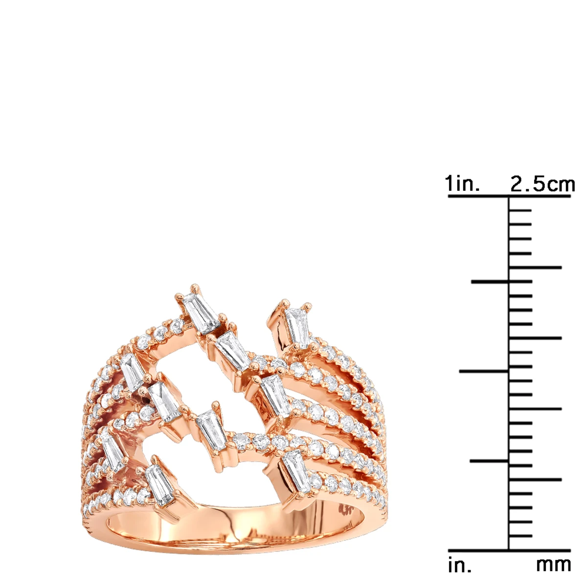 This unique 14k Gold designer Diamond Right Hand Ring for Women by Luxurman showcases 1.1 carats of masterfully set sparkling round cut and baguette cut diamonds. Very eye-catching ladies diamond ring can be worn as a cocktail diamond ring, fashion ring, right hand ring or a very unique diamond band. This gorgeous women’s diamond ring is available in 14K white, yellow and rose gold and will add an amazing sparkle to everyone’s jewelry collection!