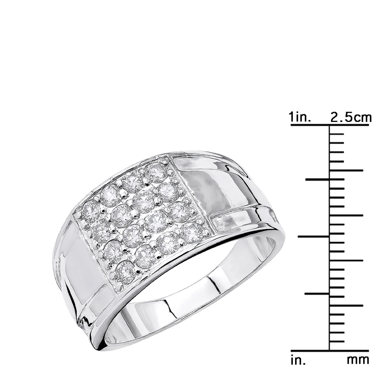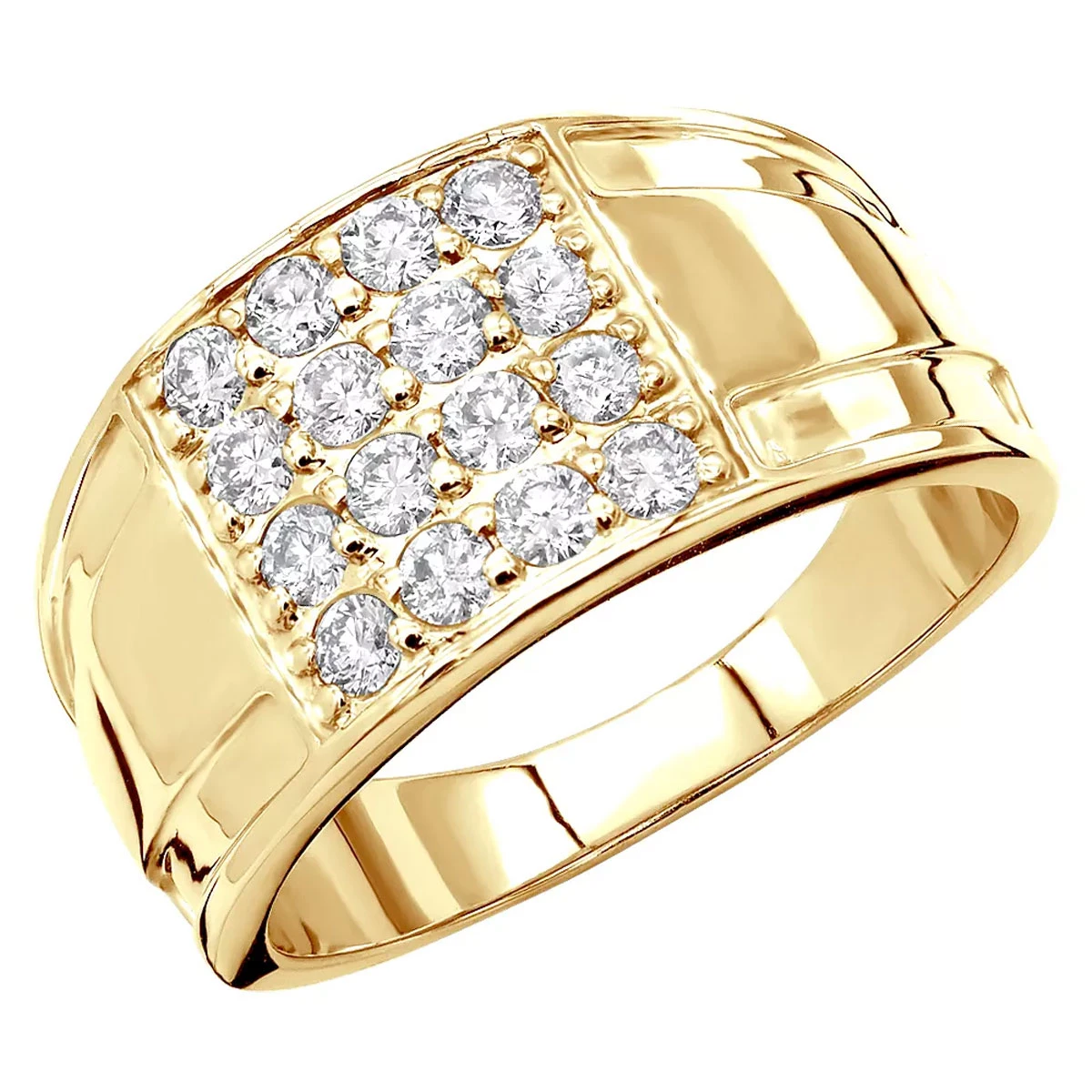 From our men’s diamond rings collection, the versatile and classy design of this 1 carat men’s diamond ring made in solid 10K Gold will also work as a pinky ring or a men’s diamond wedding band. The ring features 16 round genuine diamonds set into a square in the middle of a highly polished intricately crafted gold band. The ring is made in 10k gold, weights about 10 grams and can be worn as an everyday men’s ring, pinky ring or even a very unique wedding band. This diamond ring for men is about 12mm wide and is available in 10k yellow gold, white gold and rose gold and will look fantastic in every color (also available in 14k gold, 18k gold and Platinum as a custom order). Make a perfect sparkling addition to your jewelry collection with this architecturally exquisite men’s diamond ring!