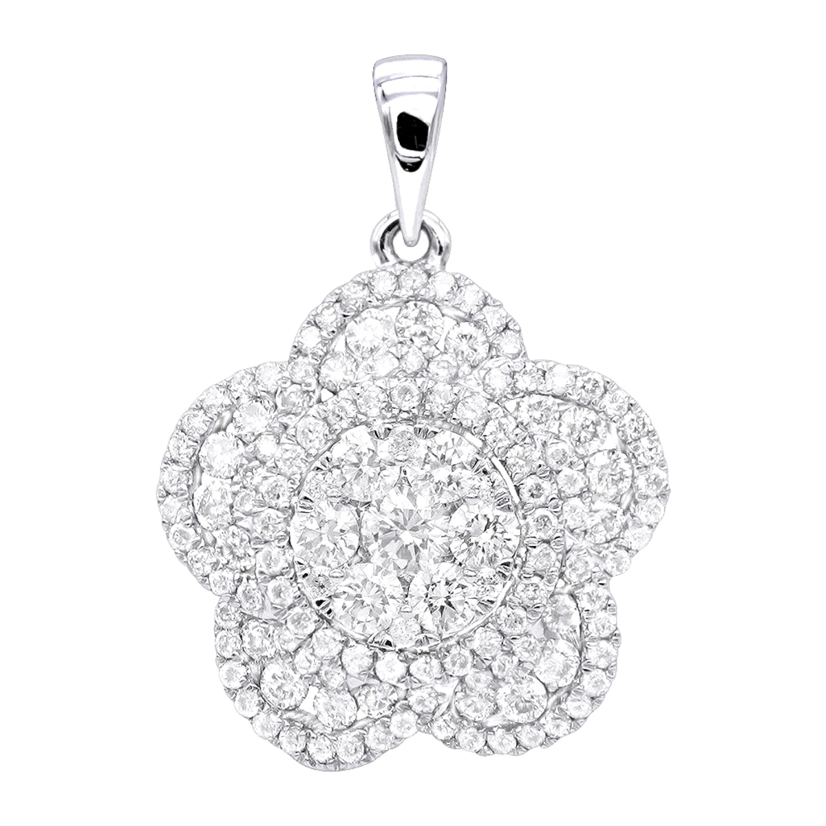 This elegant 14K Gold Designer Ladies Diamond Flower Pendant by Luxurman weighs approximately 2.5 grams and showcases 1.25 carats of dazzling round cut white diamonds, each masterfully set in lustrous 14K gold; add one of our ladies chains below to make it into a unique diamond necklace. Featuring an intricate flower design and a highly polished gold finish, this gorgeous diamond pendant for women is available in 14K white, yellow and rose gold. Matching diamond flower earrings and a diamond ring are available below. You also can personalize this piece or check we’ve already made and create your own design.