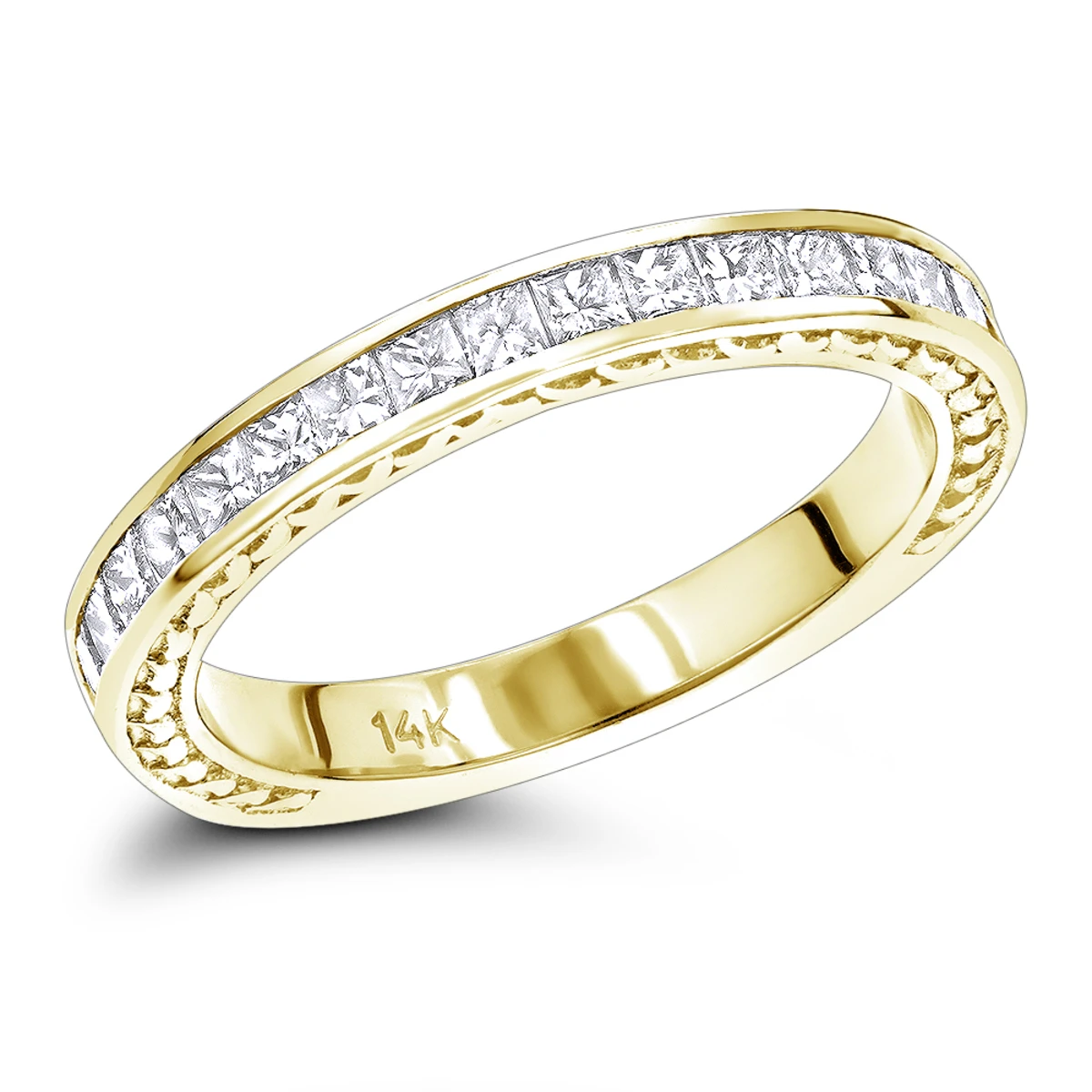 This 14K Gold Designer Diamond Wedding Band for Women by LUXURMAN showcases a unique pattern on the sides and is decorated with 0.7 carats of dazzling princess cut diamonds; this women’s diamond wedding ring is available in 14k yellow gold, rose gold, white gold, various sizes, and can be customized with any color and quality diamonds and done in 18 gold and Platinum as a custom order. Please contact us if you would like to customize it.