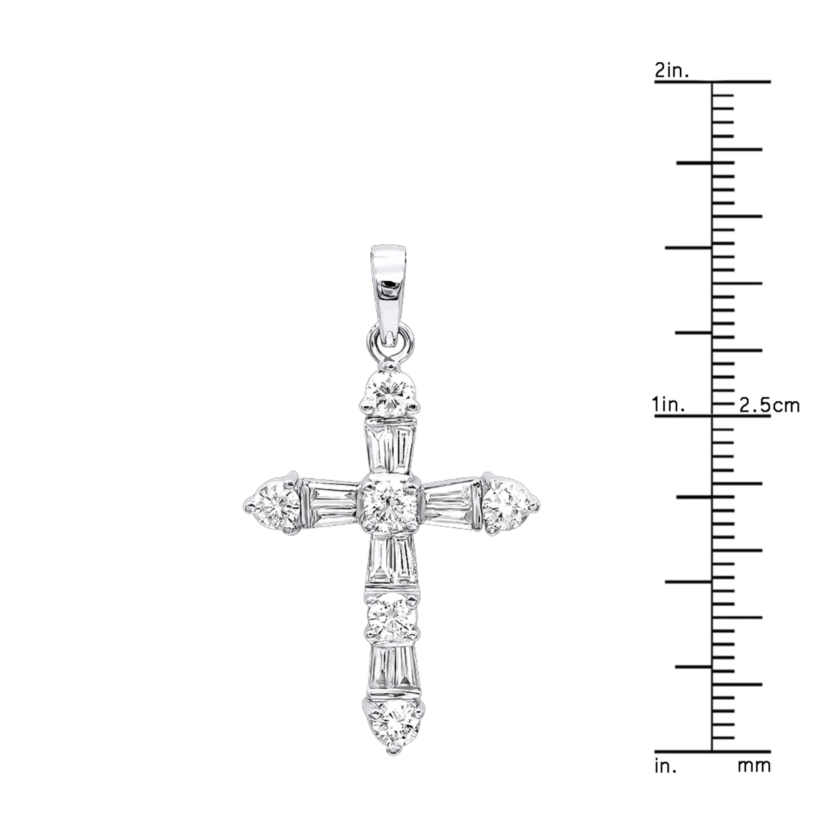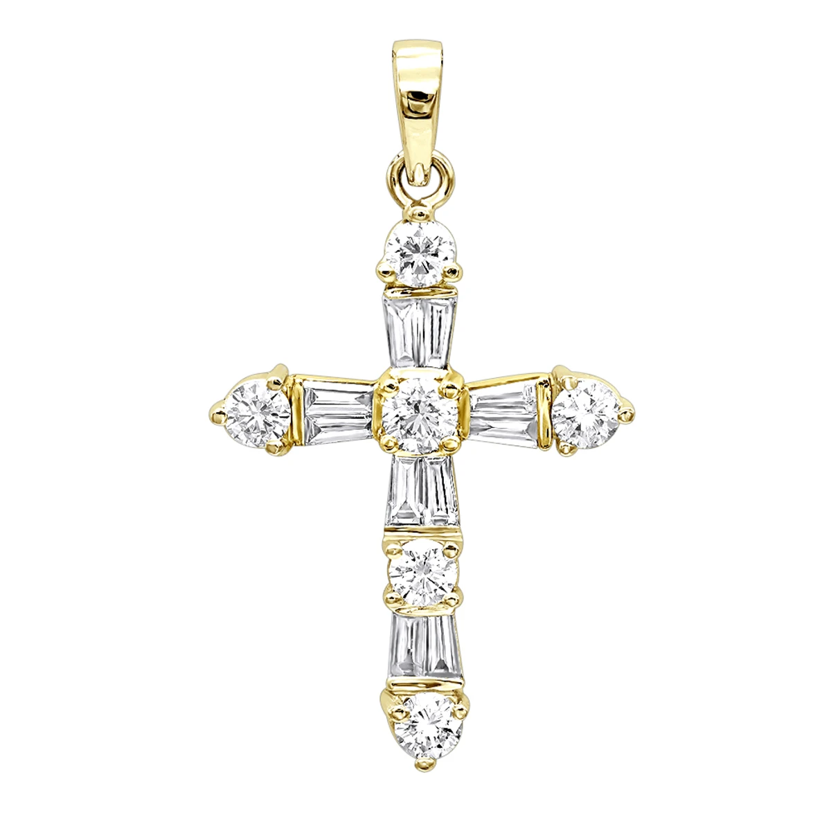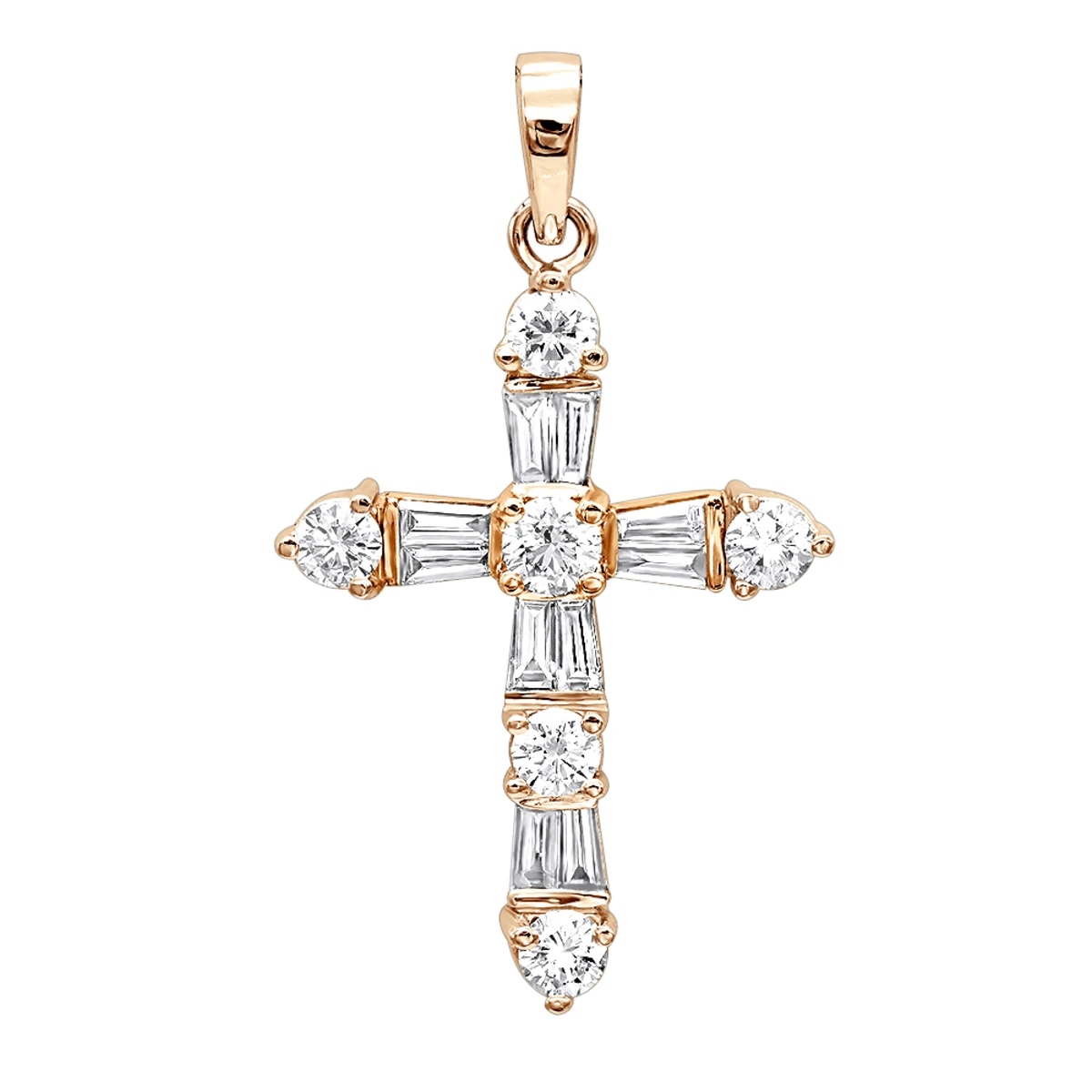 This 14K Round Diamond Cross Pendant features 1.85 carats of round & baguette cut diamonds (16 diamonds). This diamond cross pendant is available in Platinum, 18k or 14k yellow, rose, white gold, various sizes, and can be customized with any color and quality diamonds. Please note: it will take us 3-5 business days to make this pendant for you so please plan accordingly. Please contact us at 212-398-3123 if your size or desired option is not listed. You also can personalize this piece or check we’ve already made and create your own design.