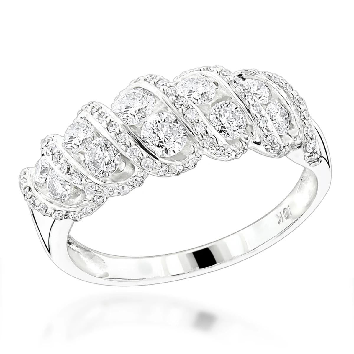 This exquisite 18K Gold Designer Women’s Diamond Rings Collection Item weighs approximately 7 grams and displays 1.5 carats of sparkling round diamonds, each masterfully pave or channel set in a luscious gold frame. Featuring an intricate design and a highly polished gold finish, this fabulous ladies diamond band is available in 18K white, yellow and pink gold.
