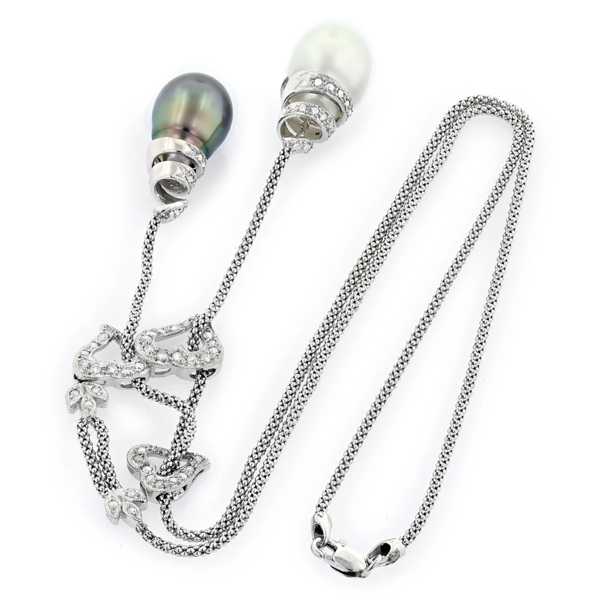 This magnificent 18K Gold Pearl and Diamond Necklace with hearts features 2 gorgeous 13.5mm south sea pearls and 0.84 ctw of accentuating round diamonds of high VS clarity. Featuring a luxurious design and a highly polished gold finish, this fabulous women’s pearl and diamond heart necklace from our designer diamond jewelry collection weighs approximately 17 grams and is available in 18K white, yellow and pink gold.