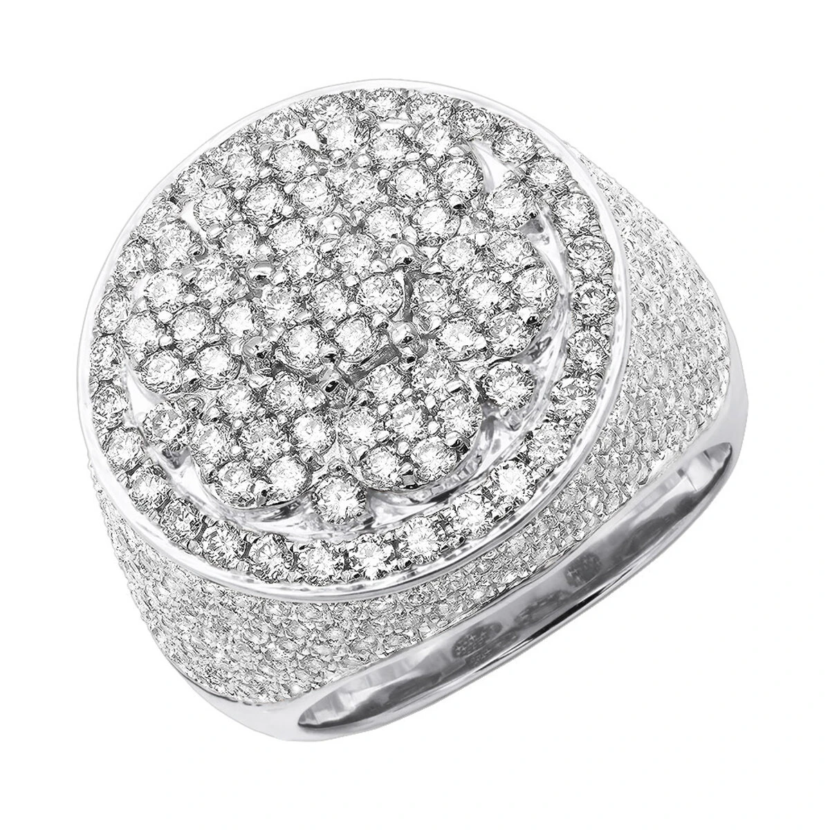 From our men’s diamond rings and pinky rings collections: This 5 Carat Diamond Cluster Ring for Men in Solid 14k Gold features impressive 5 carats of sparkling round cut diamonds masterfully cluster set on the top of the ring and in a micro pave setting on the sides of this amazing ring in highly polished 14K gold band. Showcasing an intricate voluminous design, this ring is quite large at 13/16in. (21mm) wide and makes a perfect pinky ring. Diamonds in the center of the ring are set in groups of 7 round diamonds on different levels to create striking constellations of light. Around the central composition is a diamond halo, with diamonds also scattered all over the sides of the band to its base for endless brilliance from every angle. Expertly crafted to meet the highest industry standards, you can choose this ring in the finest 14K yellow, rose or white gold.