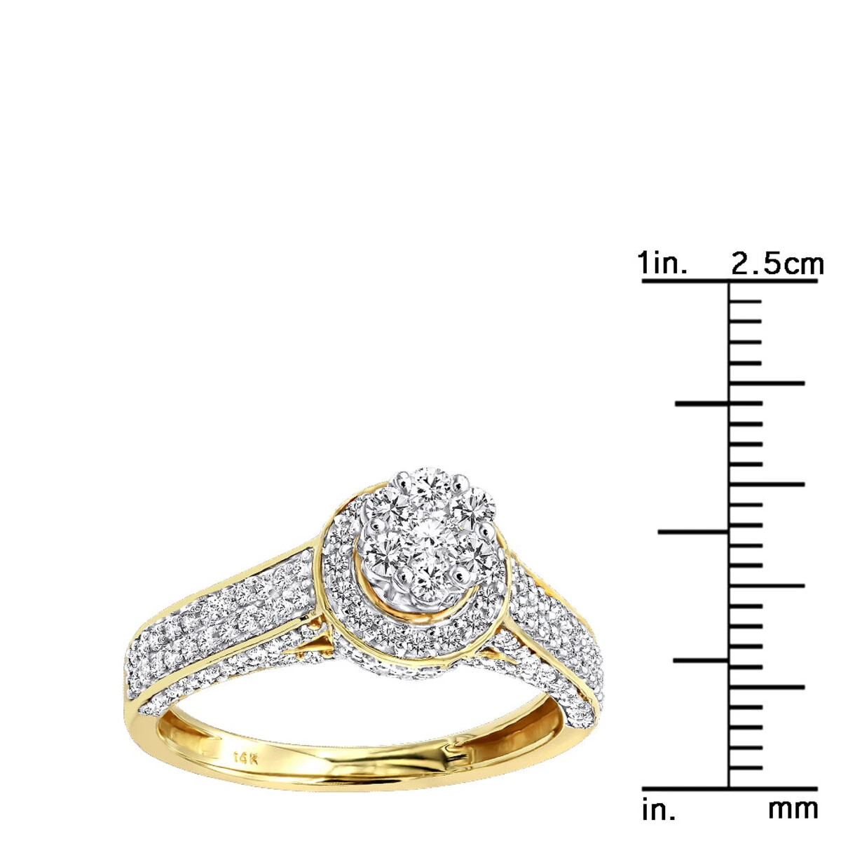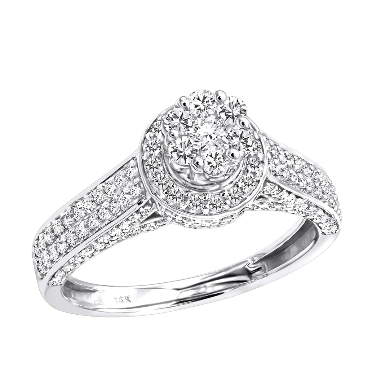 Exquisite and affordable Cluster Diamond Engagement Ring for women in 14k gold showcases a unique design and center with cluster set diamonds with a halo, this ladies diamond ring has nearly 1 carat of sparkling round diamonds (0.9ctw), each masterfully set in luscious 14K gold. Featuring a fabulous cluster design and a highly polished gold finish, this women’s diamond ring makes a unique pre-set diamond engagement ring or anniversary ring, and is available in 14K white, yellow and rose gold.