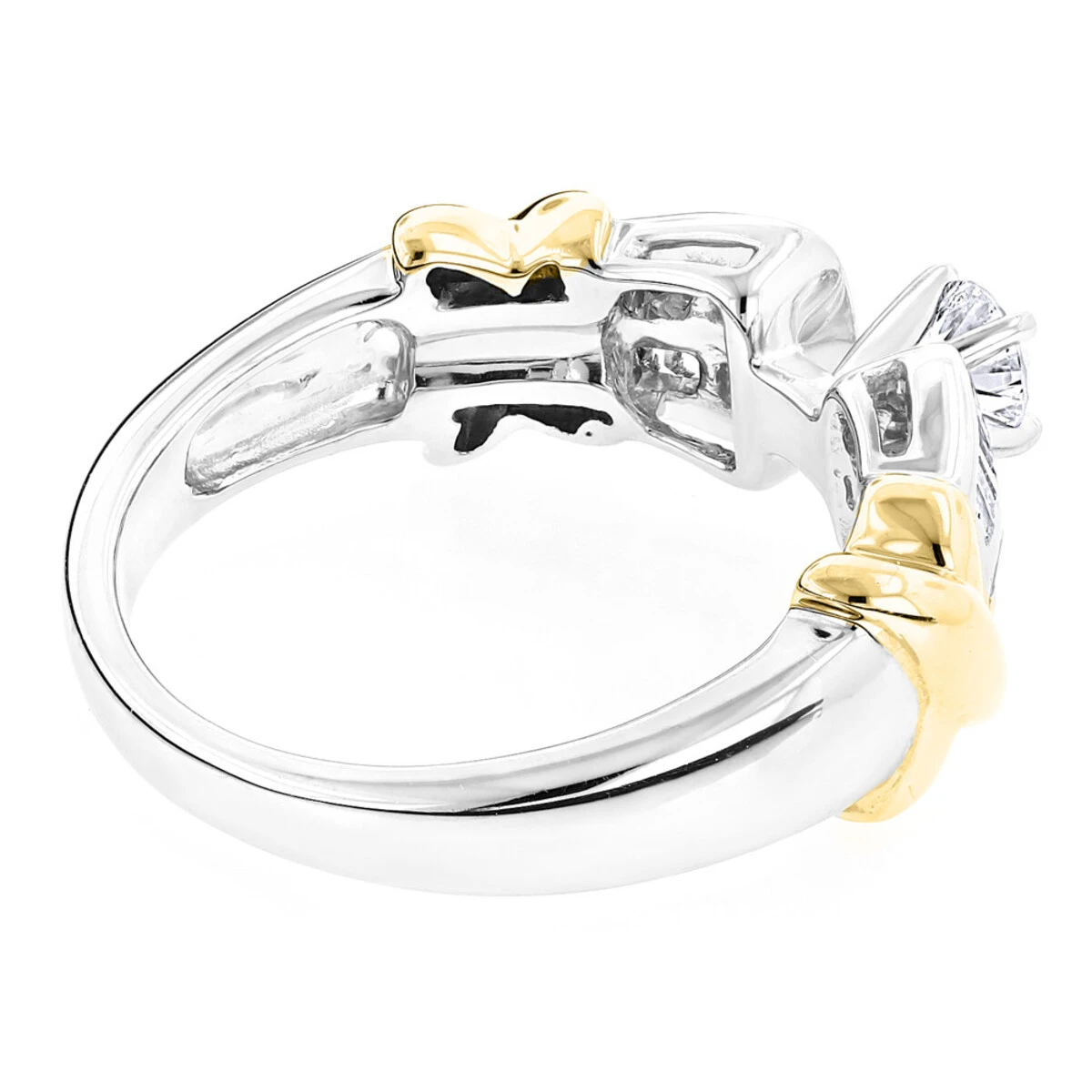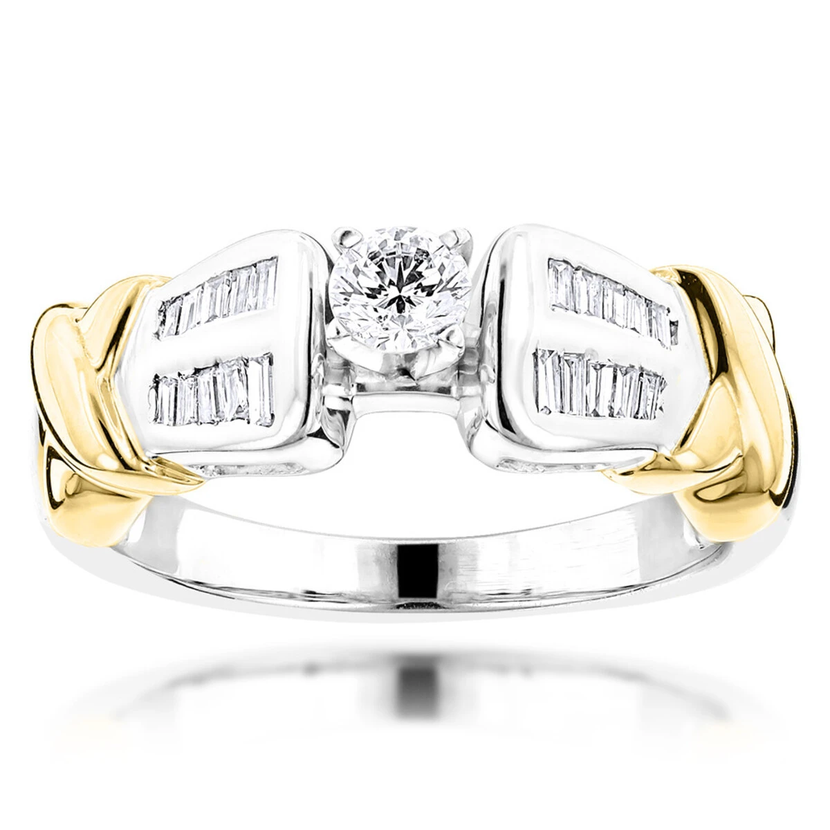 This fabulous Two Tone 14K Gold Diamond Engagement Ring showcases 0.78 ctw of sparkling channel set baguette diamonds and a prong set round solitaire diamond. Featuring an intricate design and a highly polished gold finish, this exquisite diamond engagement ring from our designer diamond bridal jewelry collection is available in 14K white, yellow and rose gold.