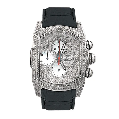 Aqua Master Iced Out Watches! This Men’s Bubble Watch by Aqua Master features 7.00 ctw of round diamonds, a diamond dial with 3 mother of pearl chronograph subdials, a polished stainless steel case and a matching leather band. This versatile men’s diamond Aqua Master watch showcases a professional chronograph movement and is water-resistant to 150 FT.