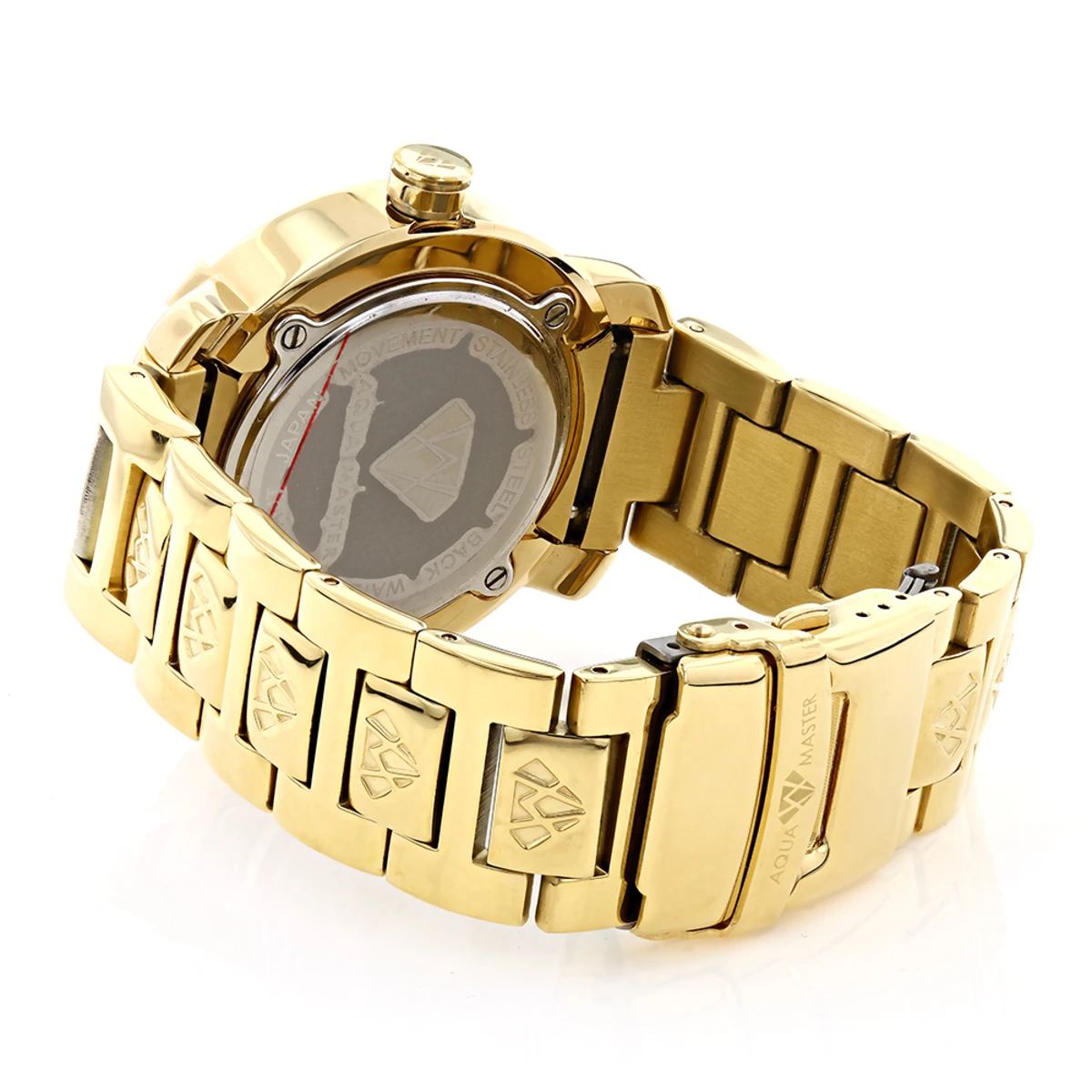 Aqua Master Watches: This Aqua Master Men’s Diamond Watch is yellow gold plated and features 0.20 carats of round diamonds, a polished 18k yellow gold plated stainless steel case with band and a yellow dial paved in white stones. This AquaMaster diamond watch showcases a fine Japan-made chronograph quartz movement and is water-resistant to 150 meters.
