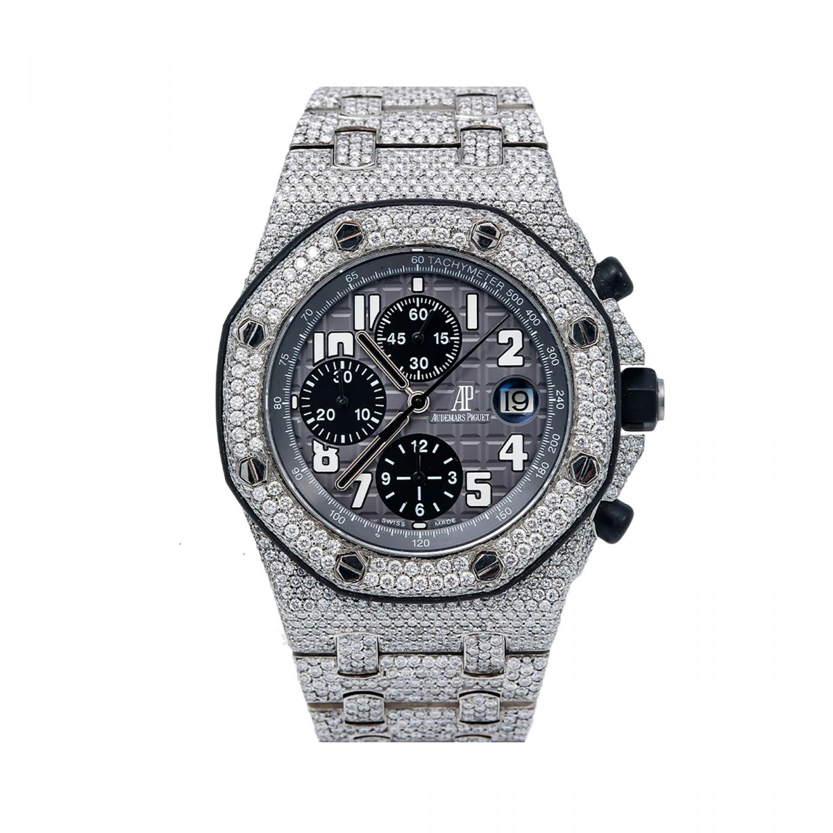 From our diamond watches for men collection: This Audemars Piguet Royal Oak Offshore Chronograph men’s diamond watch features a 42mm case, grey dial, and automatic movement. This diamond watch is iced out with 33.5 carats of round brilliant diamonds set on the bezel, case, band, and even buckle of this amazing watch. This listing is for a pre-owned watch in like-new condition with a 5-year warranty from ItsHot.com.