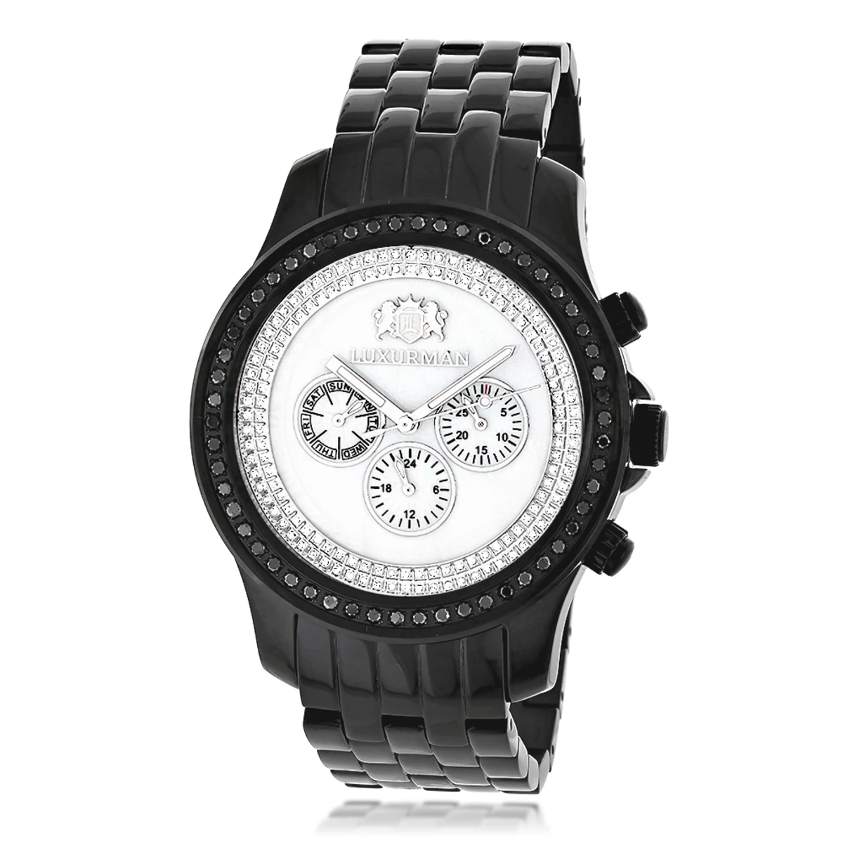 Trendy Black Diamond Watches: This Luxurman Men’s Watch features 2.25 carats of sparkling black diamonds on the bezel of the black tone stainless steel case. This Luxurman diamond watch showcases a white mother of pearl dial paved in white stones with Date/Calendar/24 hours subdials and a black tone stainless steel band. This men’s watch by Luxurman comes with two interchangeable straps in different colors and makes a perfect present for any occasion.