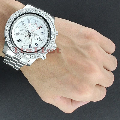 This Custom Breitling Super Avenger Chronometre Certifie 5Carat Diamond Bezel Watch features large sparkling diamonds on the bezel of a silver tone stainless steel case and a silver tone stainless steel band. This customized Breitling diamond watch showcases a white dial with three subdials and a date display window at the 3 o’clock position.