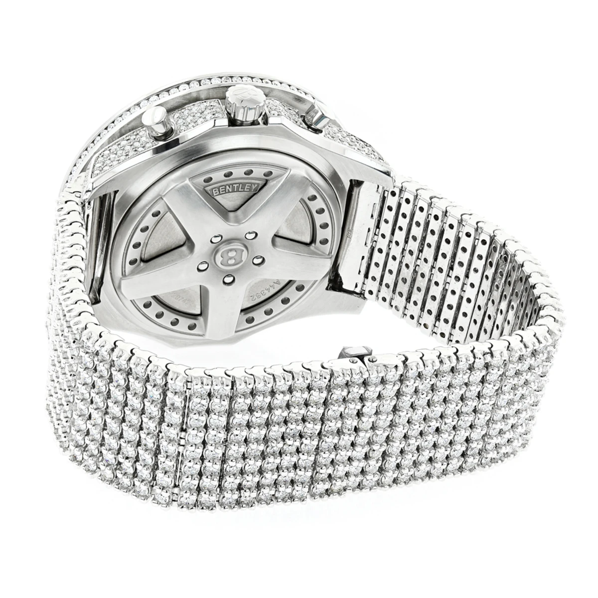 This Bust Down Fully Custom Breitling Bentley 1884 Men’s Diamond Gold Watch features 42.45 carats of dazzling diamonds on the bezel, lugs and the sides of the silver tone stainless steel case and a custom made, solid 10K white gold band fully paved in genuine diamonds. This Breitling men’s diamond watch showcases a white mother of pearl dial with three chronograph subdials and a date display window at the 12 oclock position. Water resistant.