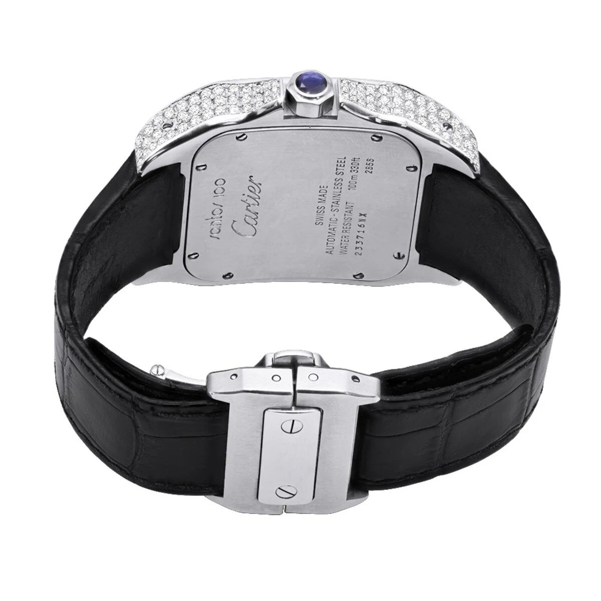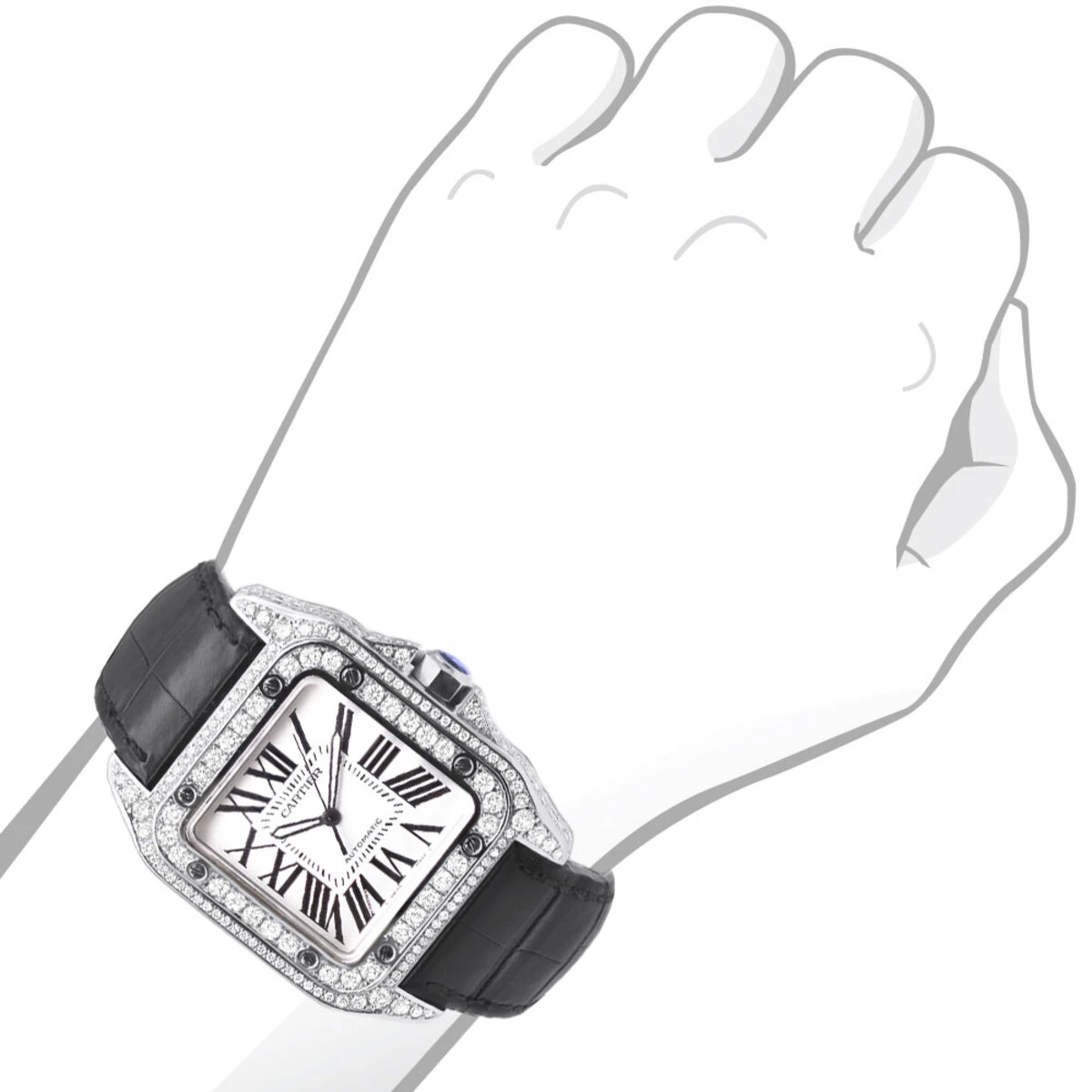 This Custom Santos de Cartier 100 Men’s Diamond Watch is pre-owned, in excellent condition and features 6.92 carats of dazzling round diamonds on the stainless steel case, steel octagonal crown set with a faceted synthetic spinel, sapphire crystal, silvered opaline dial, Roman numerals, luminescent sword-shaped black oxidized-steel hands, alligator-skin black strap, specific Santos 100 steel double adjustable deployment buckle, mechanical movement with self-winding Cartier caliber 049, water-resistant to 100 meters / 330 feet.