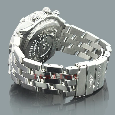 This Custom Diamond Breitling Watch from our Luxury Men’s Watches collection features 2.80 carats of dazzling diamonds on the bezel of the stainless steel case; and a silver tone stainless steel band. This Breitling diamond watch showcases a white dial with three chronograph subdials and a date display window at the 3 o’clock position.