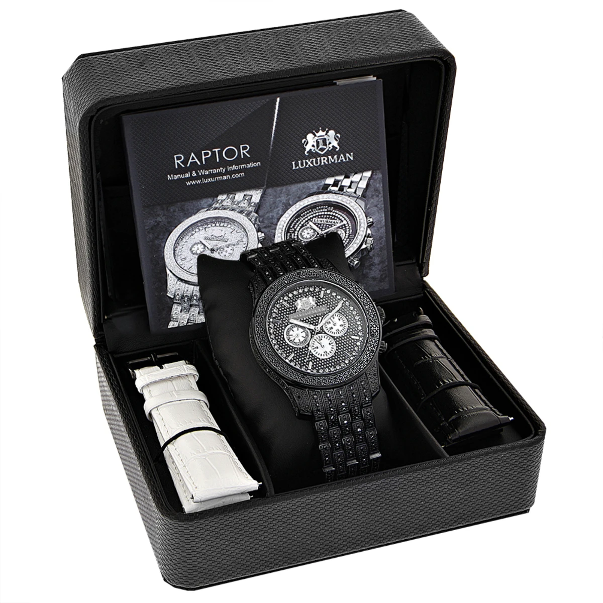 New Arrival: This Fully Iced Out Large Men’s Black Diamond Watch by LUXURMAN features 1.5 carats of black diamonds, a black tone stainless steel case and a black face paved in white sparkling stones with three white mother of pearl subdials. Showcasing a unique and classy full black appearance, this men’s diamond watch is water-resistant and makes a great gift for any occasion.