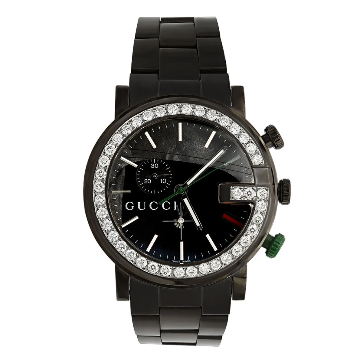 Gucci G Chrono men’s diamond watch is paved in 3.5 carats of genuine diamonds, each masterfully set around the bezel. This diamond watch features a black face with two chronograph subdials, a black tone stainless steel case and the band. Fine Swiss-made quartz movement with chronoscope function, day and date. Water-resistant 30m (100 ft).