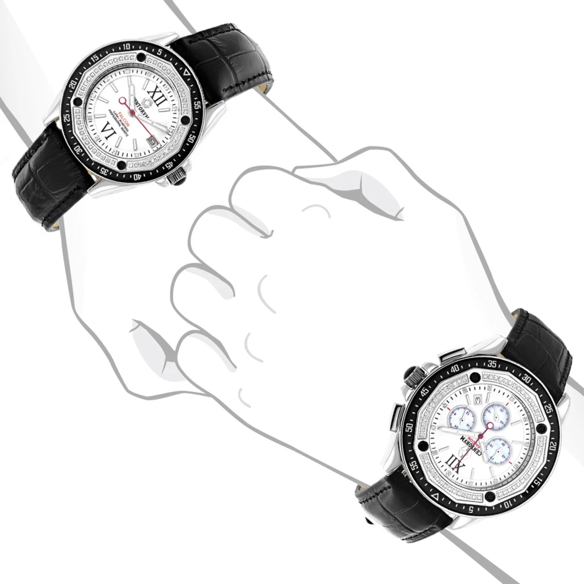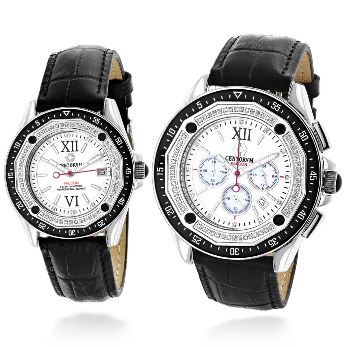 Matching His and Hers Watches: Centorum Diamond Watch Set: these two matching diamond watches features a unique design and 1.05 carats of genuine diamonds, masterfully set on the rotating Black-Silver color bezel. This watch set Featuring White Gold tone stainless steel case and black leather band. Both of these Centorum diamond watches are conveniently water-resistant to 30m (100ft) and come with a 1 year manufacturer’s warranty. The Diamond Watch for Her features 0.5 carats of genuine diamonds and white dial paved in white sparkling stones, has Quartz movement and a date display window at a 3 o’clock position. The Diamond Watch for Him is paved with 0.55 carats of genuine diamonds; features white dial paved in white sparkling stones with three white Mother of Pearl chronograph sub dials, and a date display window at a 4 o’clock position. This Watch Set is ready for a gift giving.