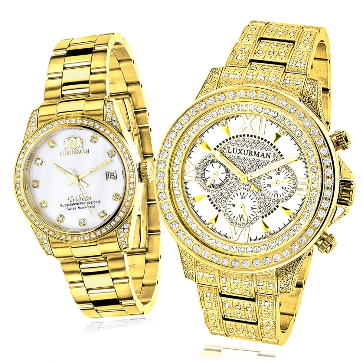 His and Hers Watches collection: We are proud to present you our His and Hers Luxurman Diamond watches. These two matching diamond watches are plated in yellow gold featuring white mother of pearl face, 18k yellow gold plated stainless steel case and 18k yellow gold plated stainless steel band. Both of these Luxurman diamond watches are conveniently water-resistant to 3 ATM and come with a 5 year manufacturer’s warranty. The Luxurman Tribeca Diamond Watch for Her features 1.5 carats of genuine diamonds and a date display window at 3 oโclock position while the Luxurman Diamond Watch for Him features 3 carats of diamonds with three subdials with date and calendar. Both diamond watches are designed in New York, and features quality made with Swiss Movements and amazing designs. “There is never enough time to do everything, but there is always enough time to do the most important thing”.