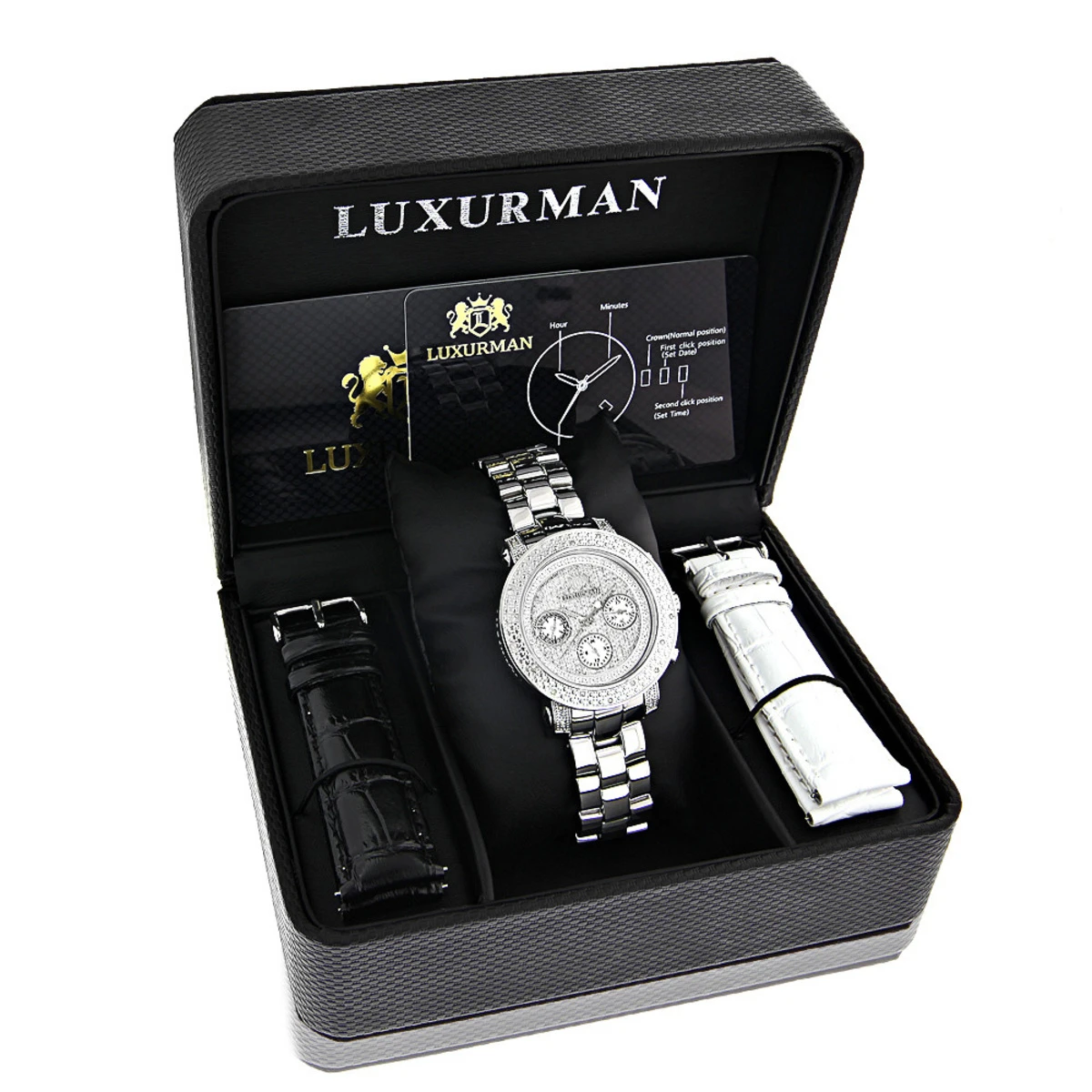 Iced out diamond watches for women: This Luxurman Diamond Watch features 0.3 carats of genuine diamonds masterfully set on the white gold plated stainless steel case. The dial has three subdials and is fully paved in white stones. This ladies iced out diamond watch comes with two extra interchangeable leather straps in different colors for extra wearing options. This Women’s Diamond Watch makes a perfect present for any occasion.