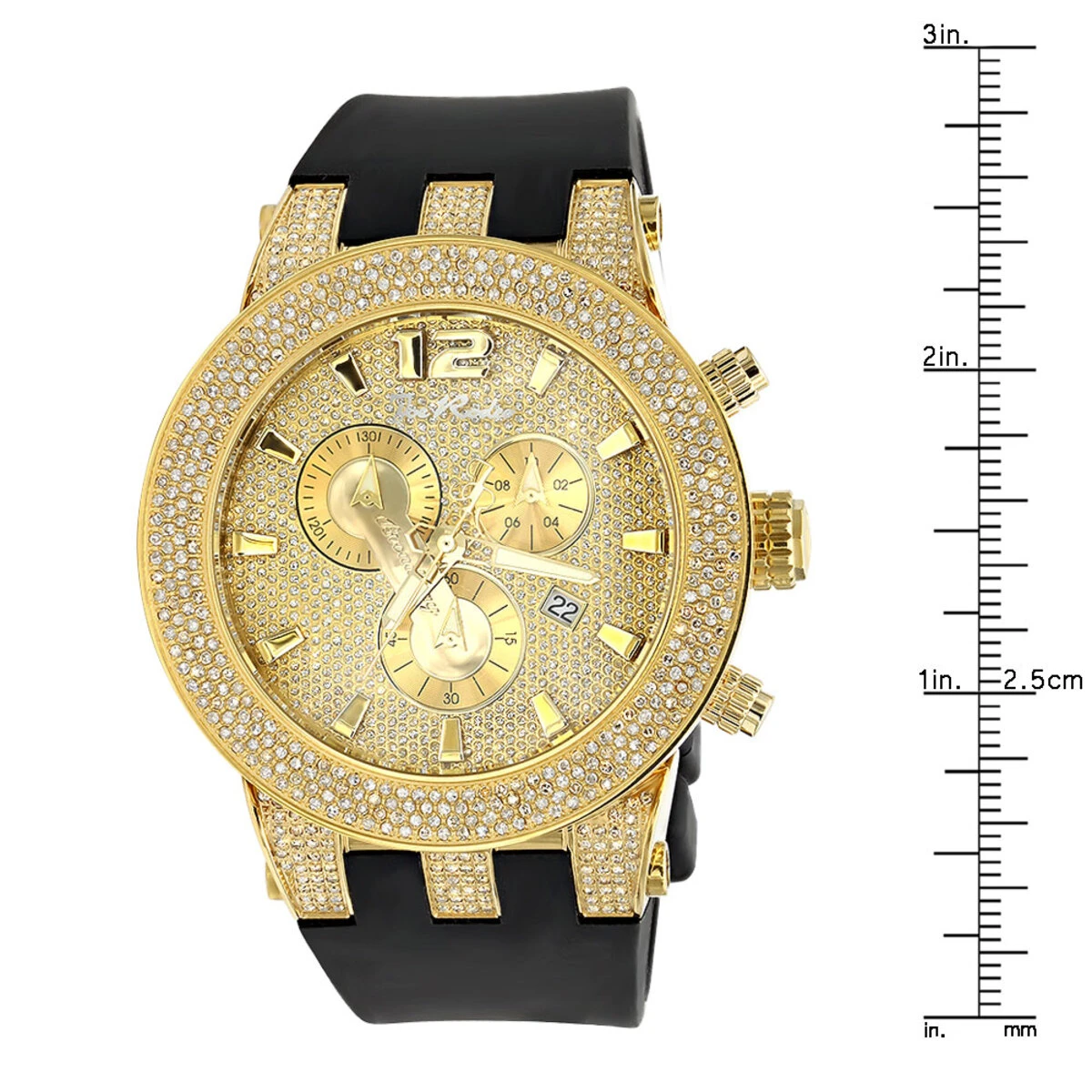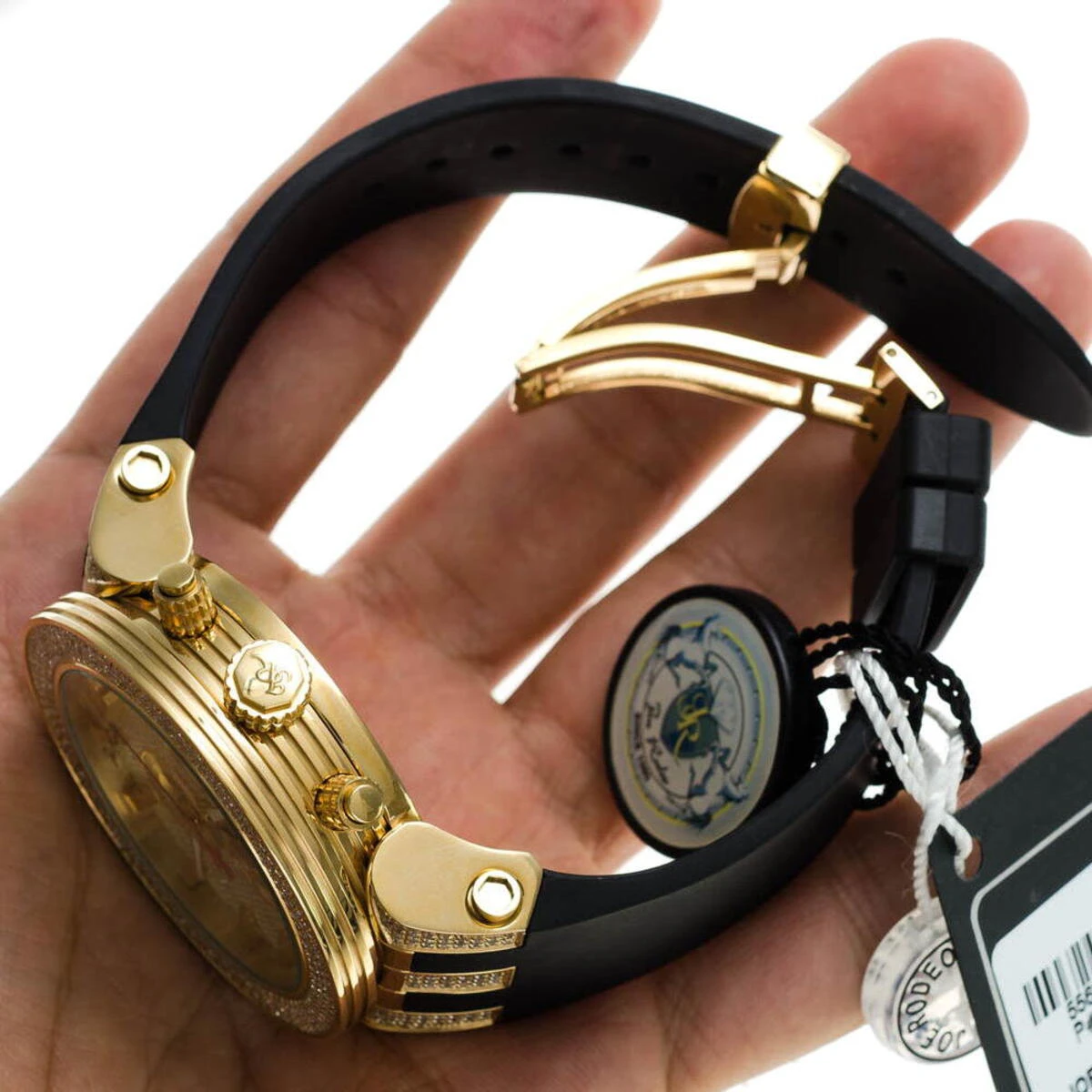 Luxurious Joe Rodeo Watches: This Broadway Men’s Diamond Watch features a very unique design, yellow gold plated stainless steel case which is paved in 5 carats of sparkling diamonds on the bezel and lugs. This Joe Rodeo diamond watch showcases iced out dial with three yellow gold tone chronograph subdials, a date display window at the 4 o’clock position, three-dimensional hour markers and a black rubber watch band. This Joe Rodeo Broadway diamond watch comes with two interchangeable rubber bands in different colors. The patented strap adjusts once for a perfect fit, and comes on and off with the press of a button. Watch is brand new, comes in retail box with full manufacturer’s warranty.