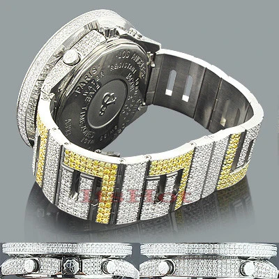 Jacob And Co Watches: This Custom Jacob & Co Five Time Zone Men’s Diamond Watch features 34 carats of genuine dazzling diamonds on the bezel, lugs, sides and the dial, a polished silver stainless steel case and a stainless steel band fully paved in white and yellow diamonds. This Jacob & Co Men’s Diamond Watch showcases a dial paved in white diamonds with 4 time zone subdials and a date display at the 6 o’clock position. The 5 time zones traveled cities: New York, Los Angeles, Tokyo and Paris. Sapphire crystal, 5 Swiss Quartz ETA Movements.