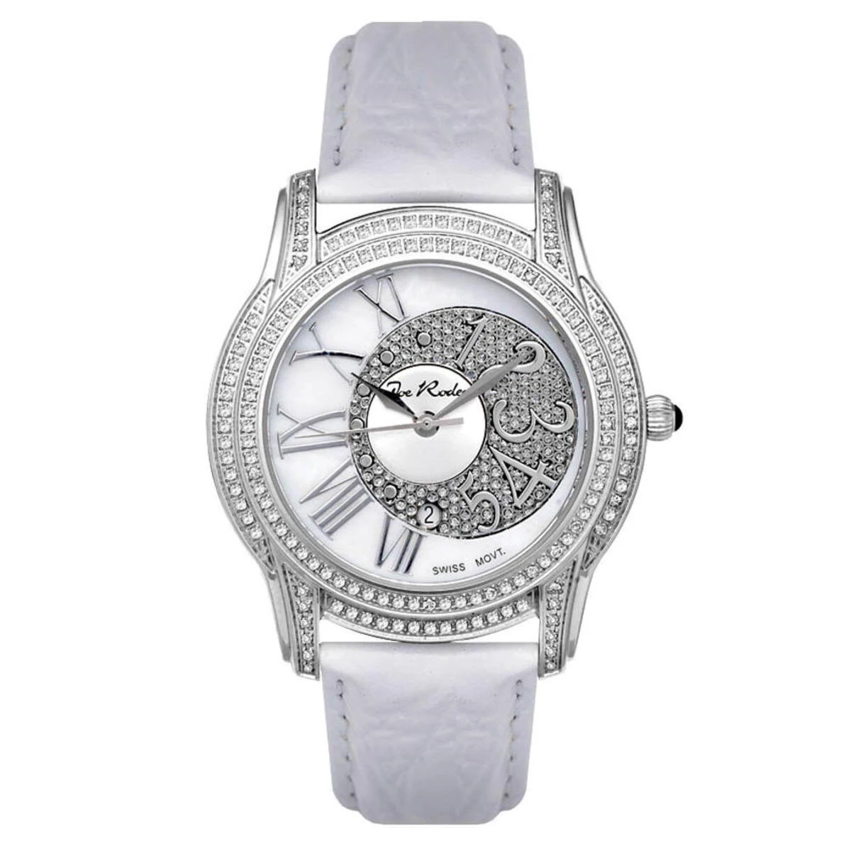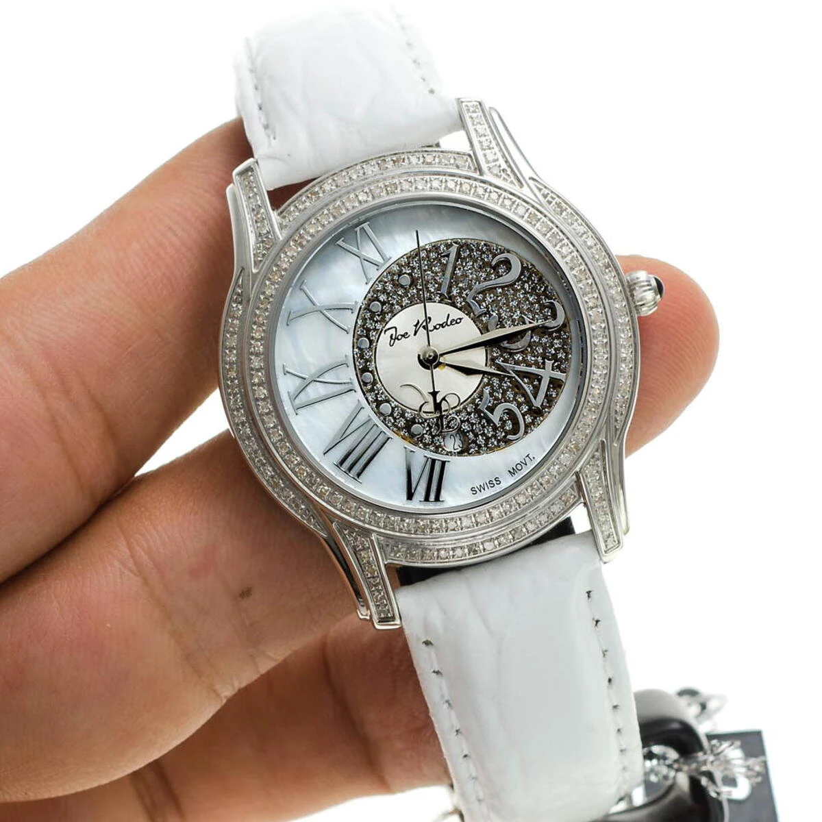 This Joe Rodeo Beverly ladies diamond watch features 1.35 carats of sparkling round diamonds, a polished round water resistant silver stainless steel case and white mother of pearl dial paved in white stones with both Arabic and roman numerals on it. This watch has white round cut diamonds around the bezel and on the lugs. Fine Swiss-made quartz movement will accurately keep time for you. This woman’s diamond watch by Joe Rodeo comes with two extra interchangeable straps.