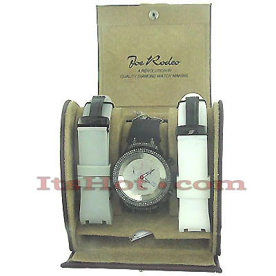 This Joe Rodeo Master Diamond Watch features 2.20 carats of genuine diamonds, a polished stainless steel case, scratch-free crystal glass, individually numbered and engraved stainless steel case-back. Diamond Bezel, Black Stainless Steel case and Silver dial. Fine Swiss-made quartz movement with chronograph function, center second and date. Water-resistant to 50 meters. This luxurious diamond watch from Joe Rodeo watches collection comes with two extra interchangeable rubber straps in different colors. The patented strap adjusts once for a perfect fit, and comes on and off with the press of a button.