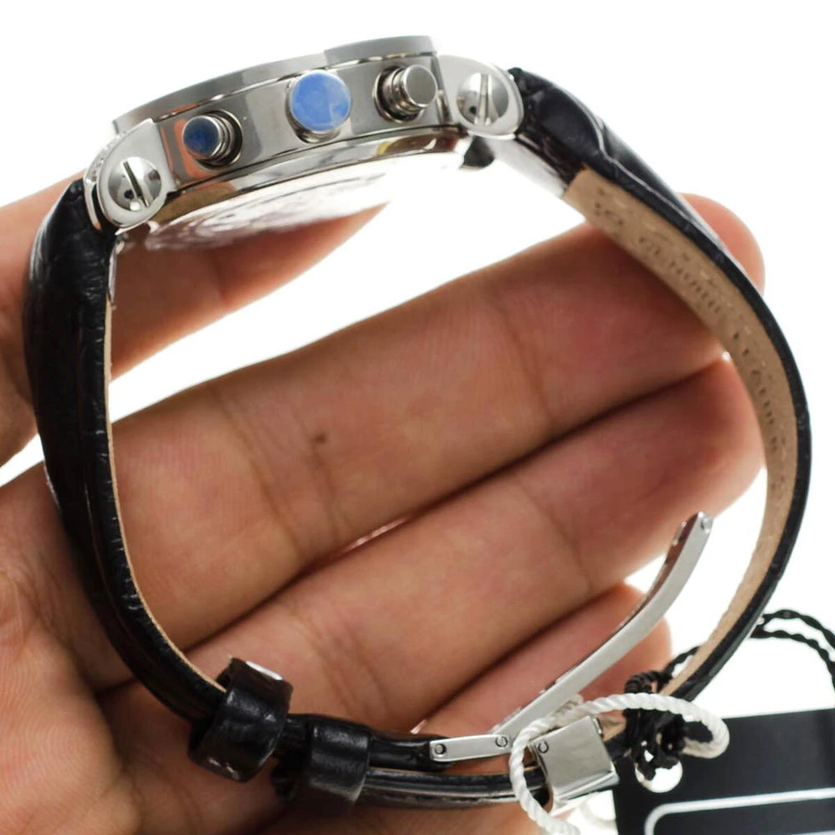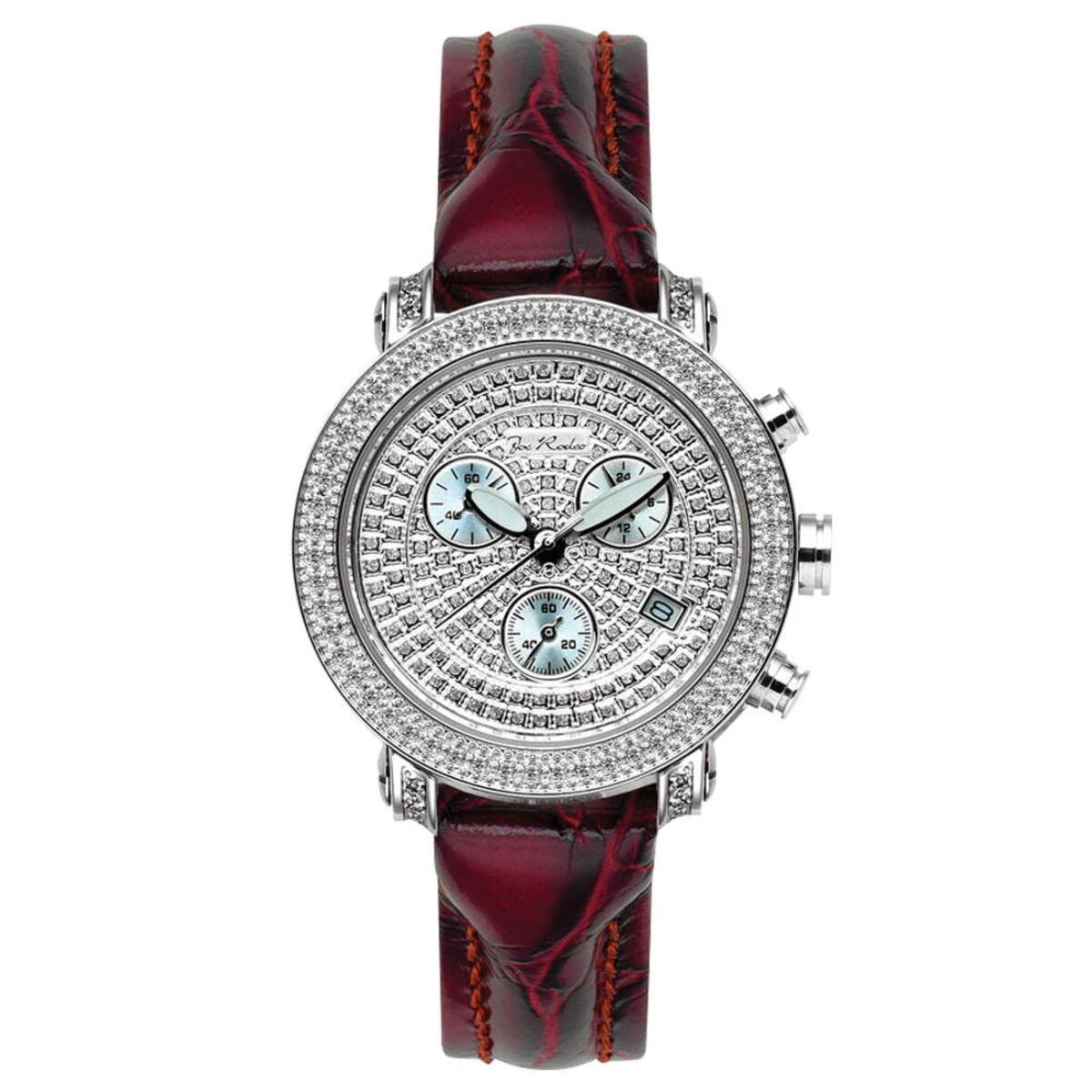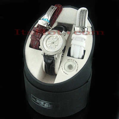 This fabulous JoJo Joe Rodeo women’s diamond watch features 0.60 carats of diamonds, a polished Silver stainless steel case and black leather band. This watch features white diamonds around the bezel and white dial paved in white stones. Accurate Japan-made quartz movement with chronograph function. This luxurious women’s diamond watch by Joe Rodeo comes with two extra interchangeable bands in different colors. Water-resistant 100m (330 ft).