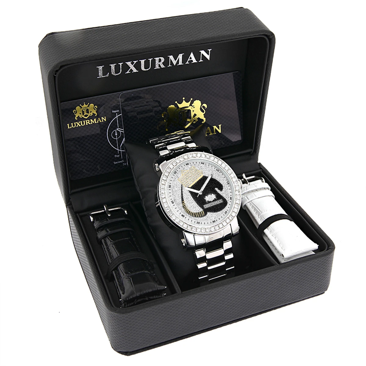 Designer Large Luxurman Phantom 0.12ct Black Diamond Watch For Men White Dial