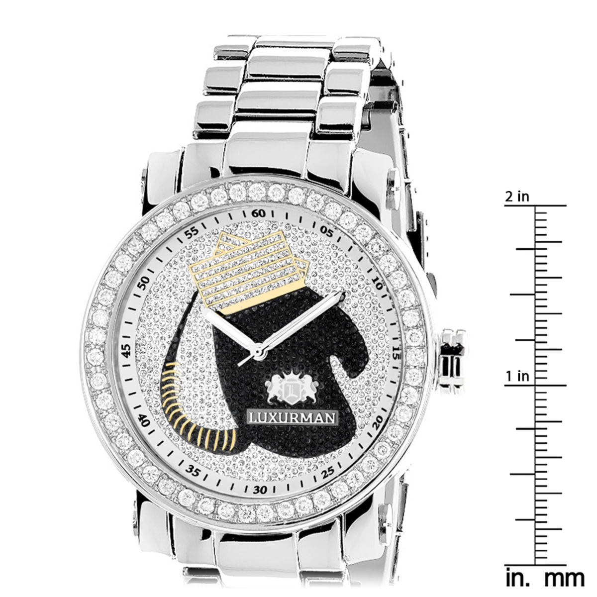 This Large Diamond Men’s Watch with Boxing Gloves – Luxurman Southpaw Edition – features 4 carats of VS quality white sparkling diamonds, polished white gold plated stainless steel case, diamond bezel and dial paved in sparkling stones with boxing gloves design. Water-resistant to 30 m (110 ft). This LUXURMAN diamond watch for men is a unique watch model, inspired by the boxing movie Southpaw. The film features unique jewelry and custom pieces on Jake Gyllenhaal and his crew, made by ItsHot.com and Luxurman.