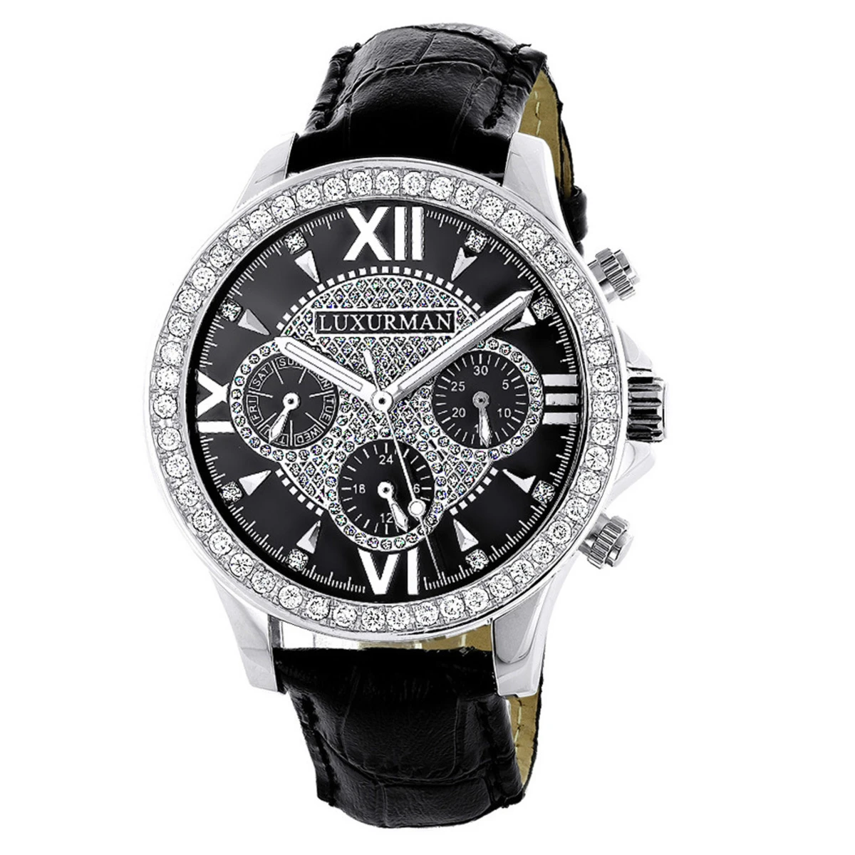 Luxurman Large Black Diamond Watch For Men With Leather Band 0.12ct
