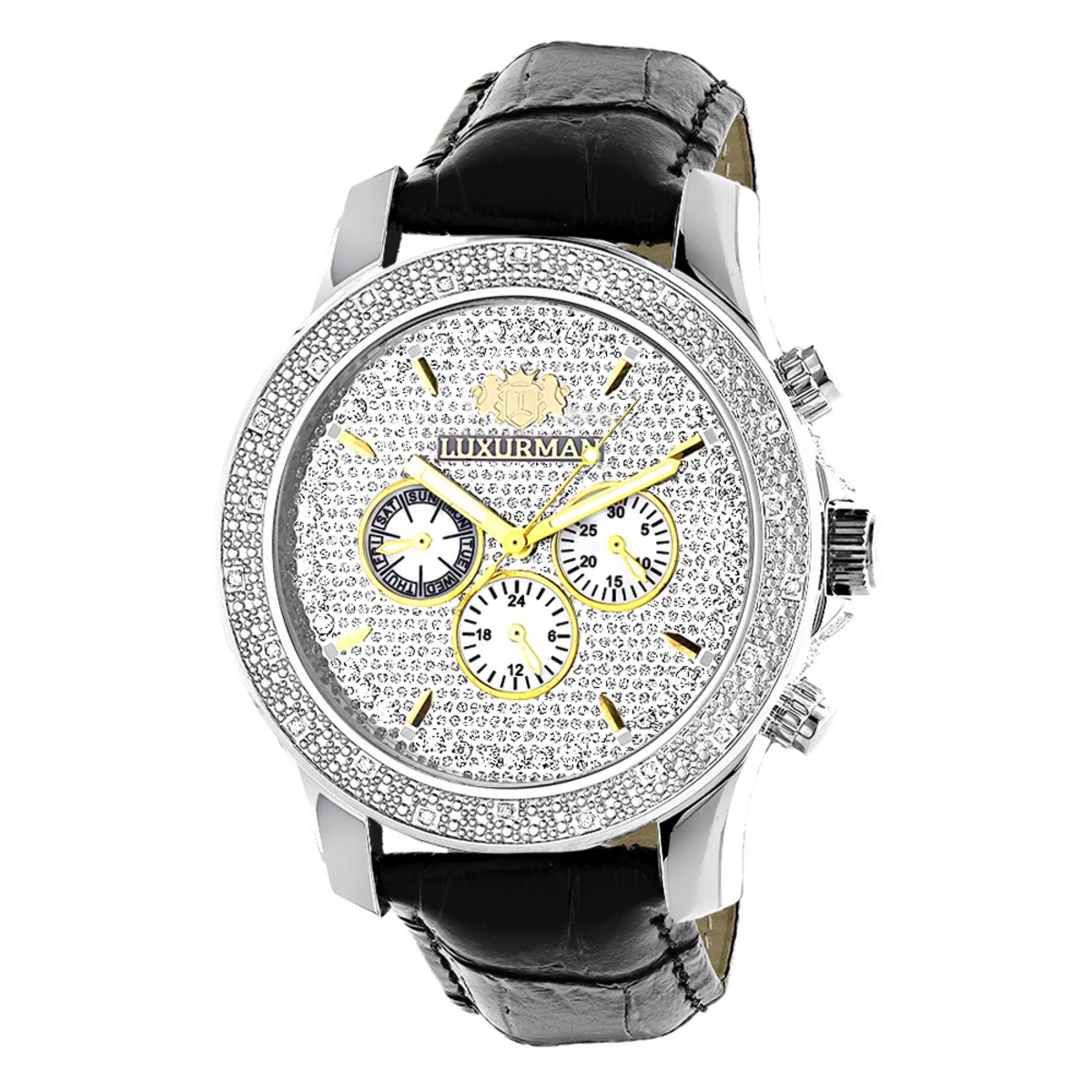 This Luxurman men’s diamond watch with a leather watch band features 0.25 carats of genuine diamonds on the bezel of the silver tone stainless steel case. This Luxurman Diamond Watch showcases a yellow gold tone dial paved in white stones with Date/Calendar/24 hours subdials and a genuine black leather band. This diamond watch by Luxurman comes with two interchangeable straps in different colors. This Luxurman Diamond watch is a perfect present for any occasion.