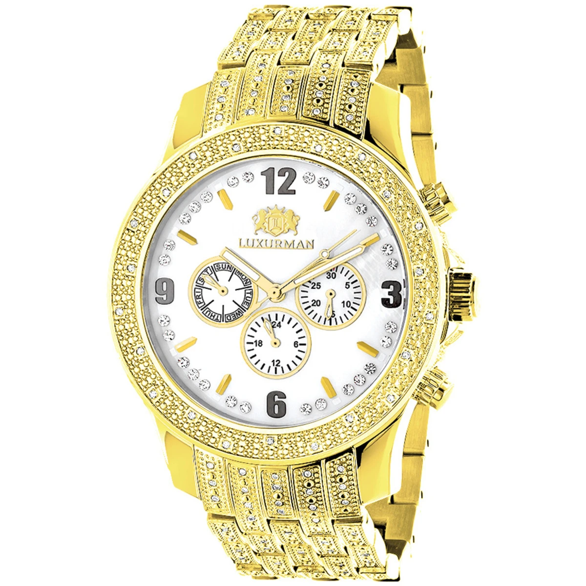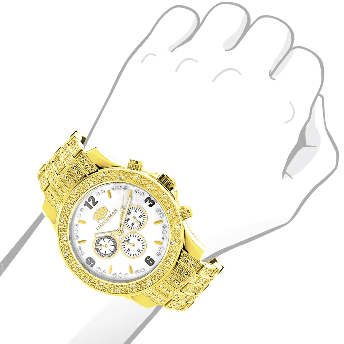 This Luxurman Men’s Diamond Watch features 1 carat of diamonds, polished yellow gold plated stainless steel case and a white mother of pearl dial with three subdials and a date display on it. This diamond watch comes with 2 extra bands.