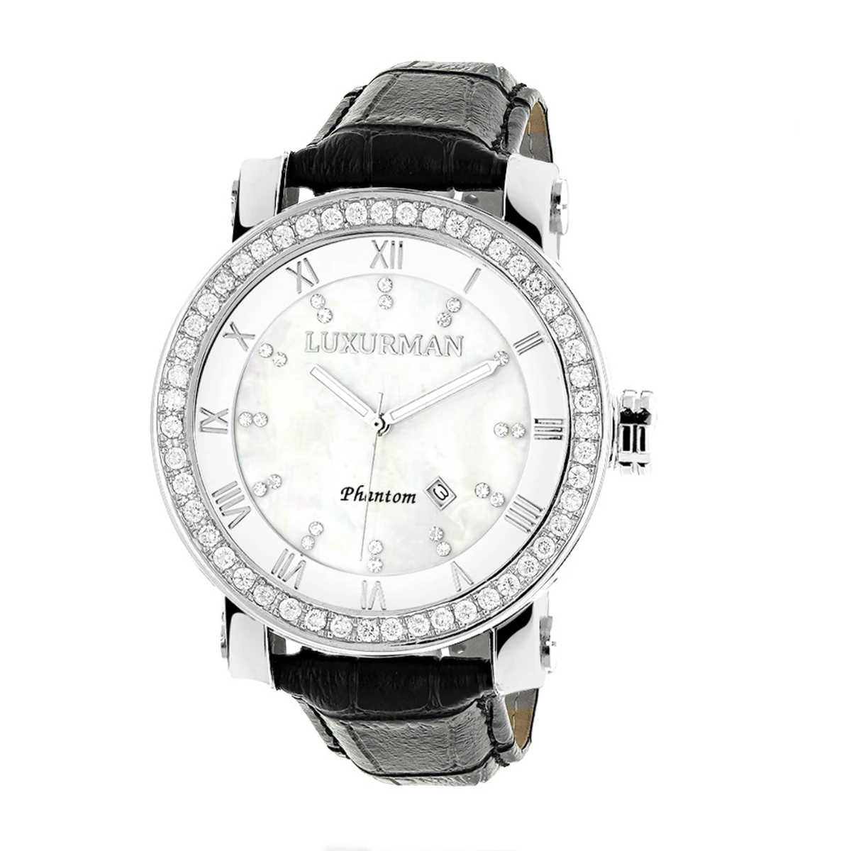 This Luxurman men’s diamond watch features 4 carats of VS quality white sparkling diamonds, polished silver stainless steel case with a soft genuine black leather band and a white mother of pearl dial with day, date and 24 hours subdials. Water-resistant to 30 m (110 ft).