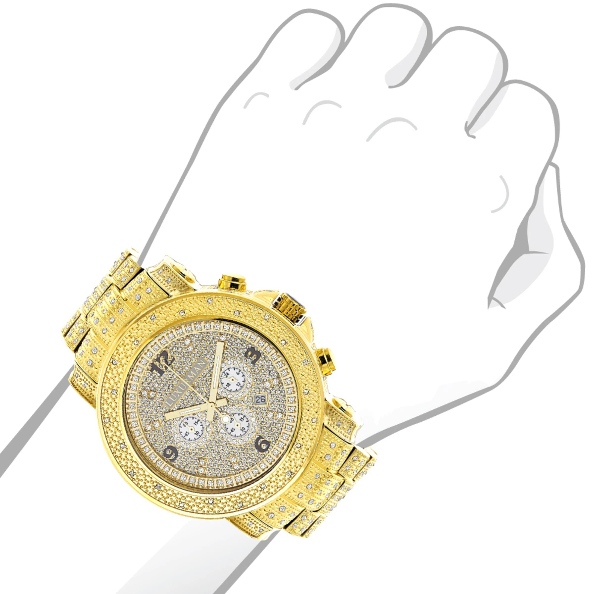 This Oversized Iced Out Men’s Diamond Watch by Luxurman features a yellow gold plated stainless steel case and band and is fully iced out with 2 carats of genuine diamonds. The dial of this LUXURMAN wrist watch is paved in white sparking stones and showcases three white mother of pearl chronograph subdials and a date display window between 4 and 5 o’clock position. This men’s diamond watch is a fantastic gift for a special occasion.