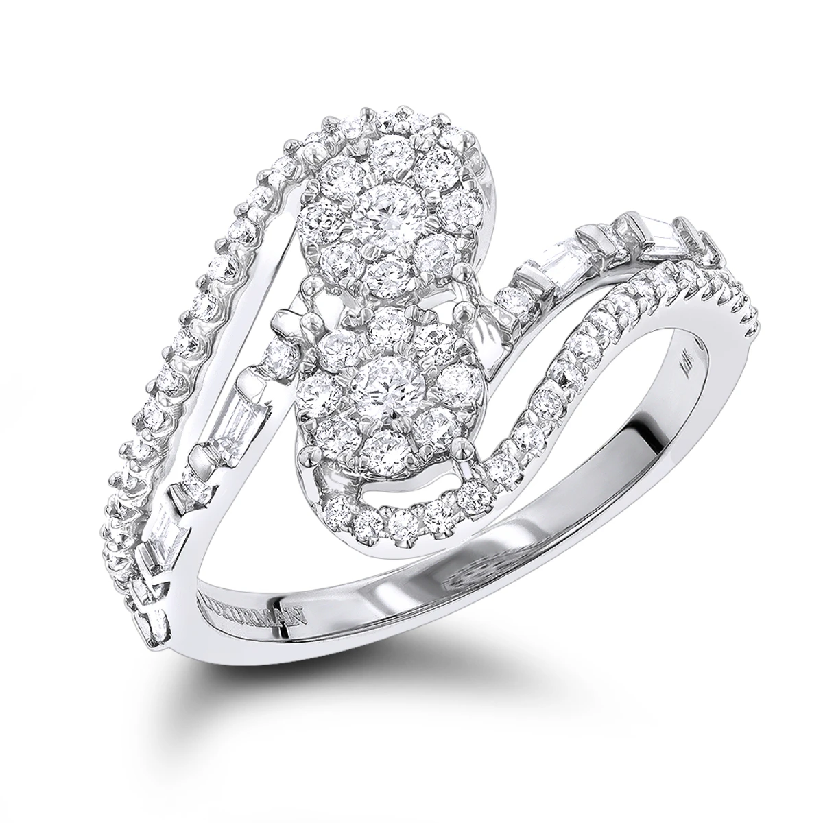 LUXURMAN Unique Women’s Diamond Rings: This 14K Gold 2 Cluster Diamond Ring is an elegant diamond ring features 0.8 carats of round and baguette dazzling white diamonds set in 14K gold base – two sparkling round cut diamond clusters pave set in a swirl design with diamonds. The two clusters ring has it all: an appealing look and a design with meaning – one cluster represent love and one friendship, making a great present for any occasion. This women’s ring is available in 14K white gold, yellow gold and rose gold.