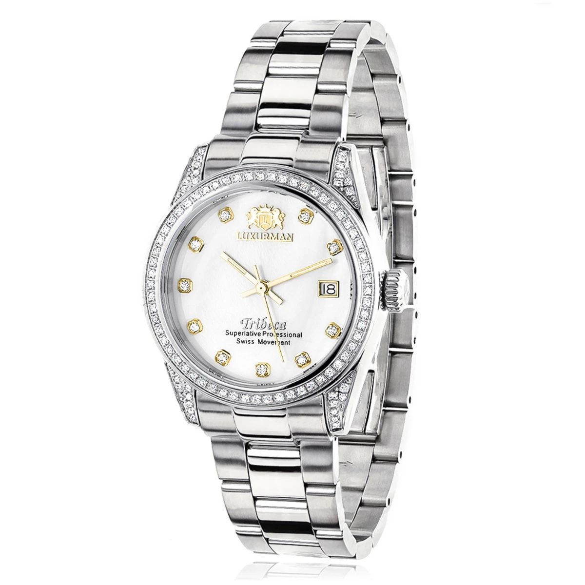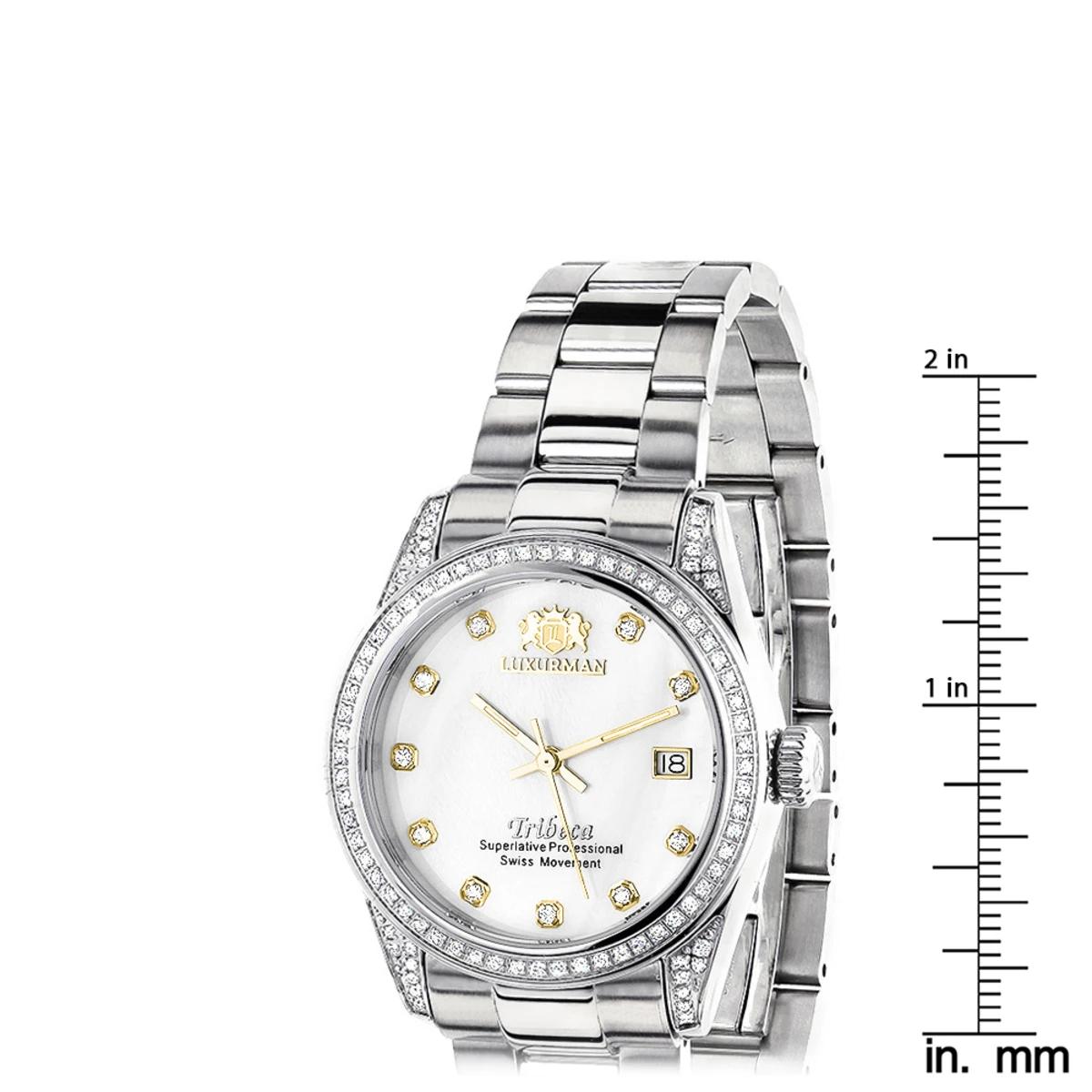 This Luxurman Women’s Diamond Watch in stainless steel Tribeca features 1.5 carats of genuine diamonds, a luxurious mother of pearl dial, Swiss movement and a date display window at a 3 o’clock position. This stylish women’s diamond Luxurman watch comes with two extra leather interchangeable straps in different colors and full 5 year factory warranty. This Luxurman Diamond watch is a perfect present for any occasion.