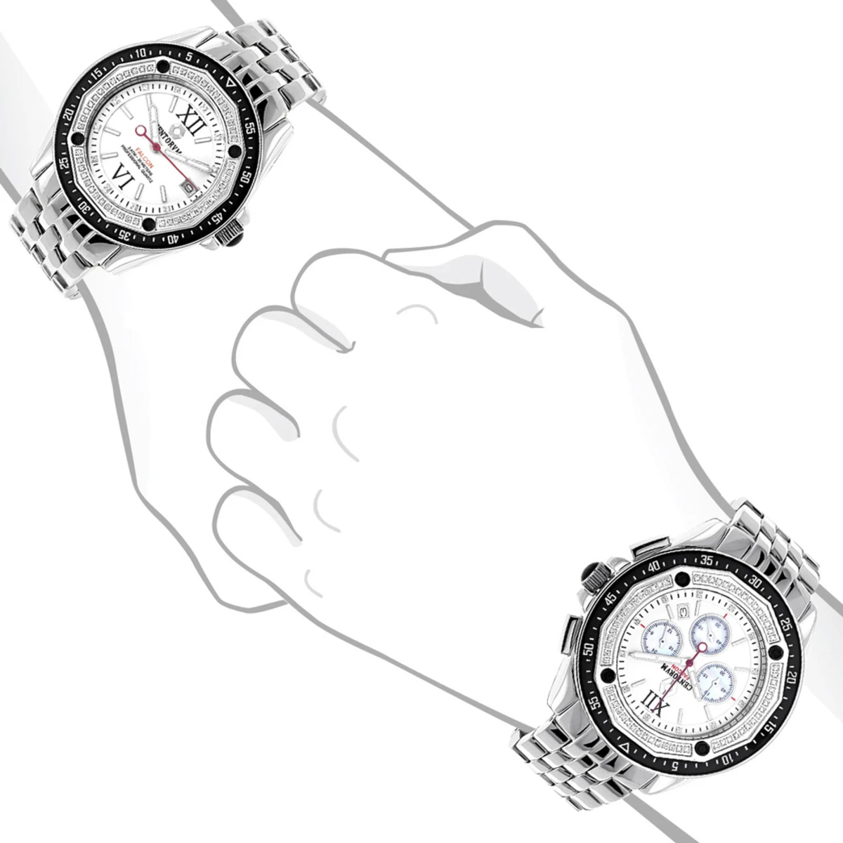 His and Hers Watch collection: Centorum Diamond Watch Set. This Centorum Chronograph Falcon Diamond Watch Set features unique design and 1.05 carats of genuine diamonds, masterfully set on the rotating bezel of the silver tone stainless steel case. Both of these diamond watches are conveniently water-resistant to 30m(100ft) and come with 1 year warranty. The Women’s Diamond Watch features 0.5 carats of genuine diamonds, has a white mother of pearl dial, a date display window at the 3 o’clock position. The Men’s Diamond Watch showcases 0.55 carats of genuine diamonds and has a white mother of pearl dial with three chronograph subdials, a date display window at the 4 o’clock position. The watches are beautifully packaged, ready for gift-giving