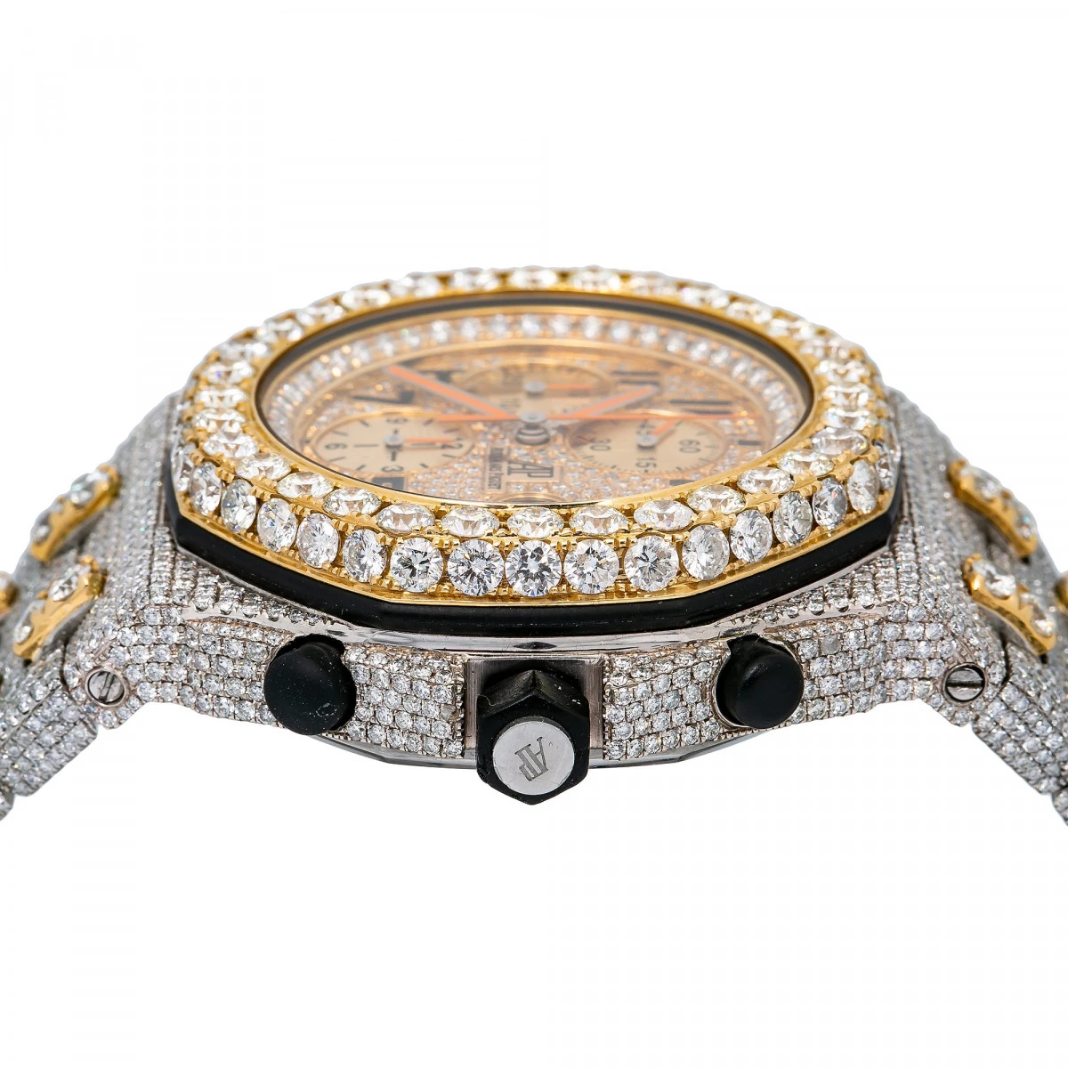 The Audemars Piguet Royal Oak Offshore Men’s Gold Diamond Watch is a luxurious timepiece that exudes sophistication and style. This watch features a yellow dial with diamond markers and a bezel set with 31.25 carats of white diamonds. The case is crafted from 18K gold and features a 42mm diameter. The bracelet is made from a combination of 18K gold and stainless steel, and is finished in a striking yellow hue. The watch is powered by an automatic movement and is water resistant up to 100 meters.This watch is perfect for the man who appreciates the finer things in life. It is a timeless piece that will never go out of style. The diamonds add a touch of sparkle and glamour, while the yellow dial adds a touch of warmth and sophistication. The combination of gold and stainless steel gives the watch a modern look that is sure to turn heads. The engravable case back makes this watch a perfect gift for a special occasion.The Audemars Piguet Royal Oak Offshore Men’s Gold Diamond Watch is a luxurious timepiece that will stand the test of time. With its timeless design and luxurious materials, this watch is sure to be a treasured piece for years to come.