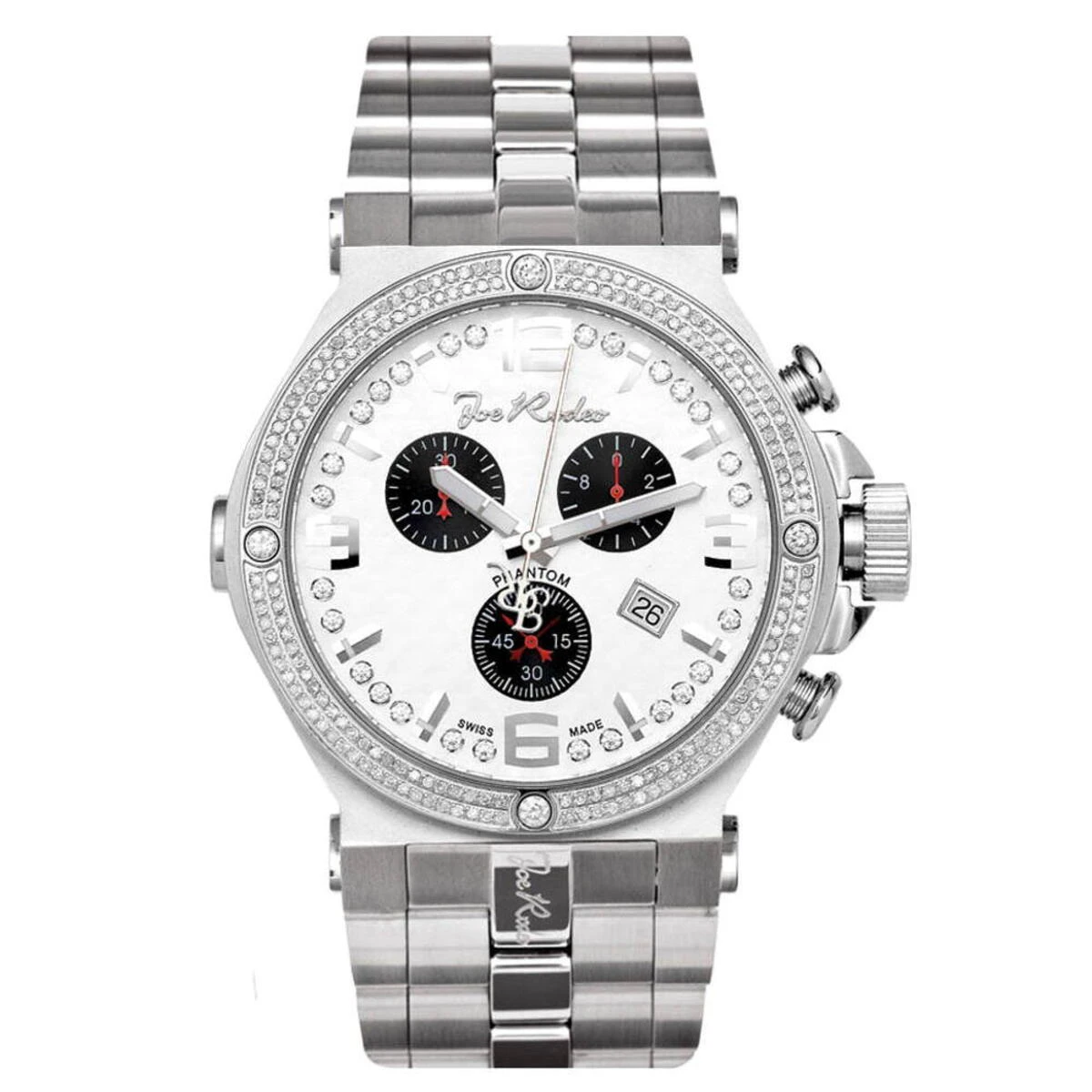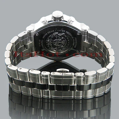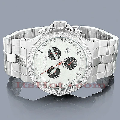 Luxurious Men’s Diamond Watches! This JoJo Joe Rodeo Phantom men’s diamond watch features 2.25 carats of diamonds, stainless steel case, scratch-free crystal glass and brushed stainless steel band. This watch has two rows of white sparkling diamonds around the bezel. The watch also features brushed Silver Stainless Steel dial with three black sub dials, Silver tone hour markers and a row of sparkling white stones around it. Super accurate Swiss-made quartz movement with chronograph function will keep the time for you. Water-resistant 100m (330 ft).