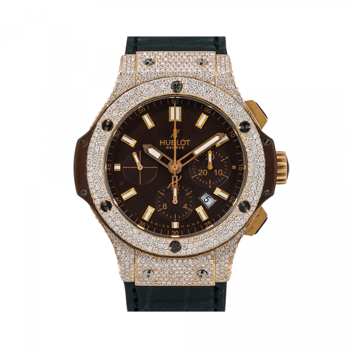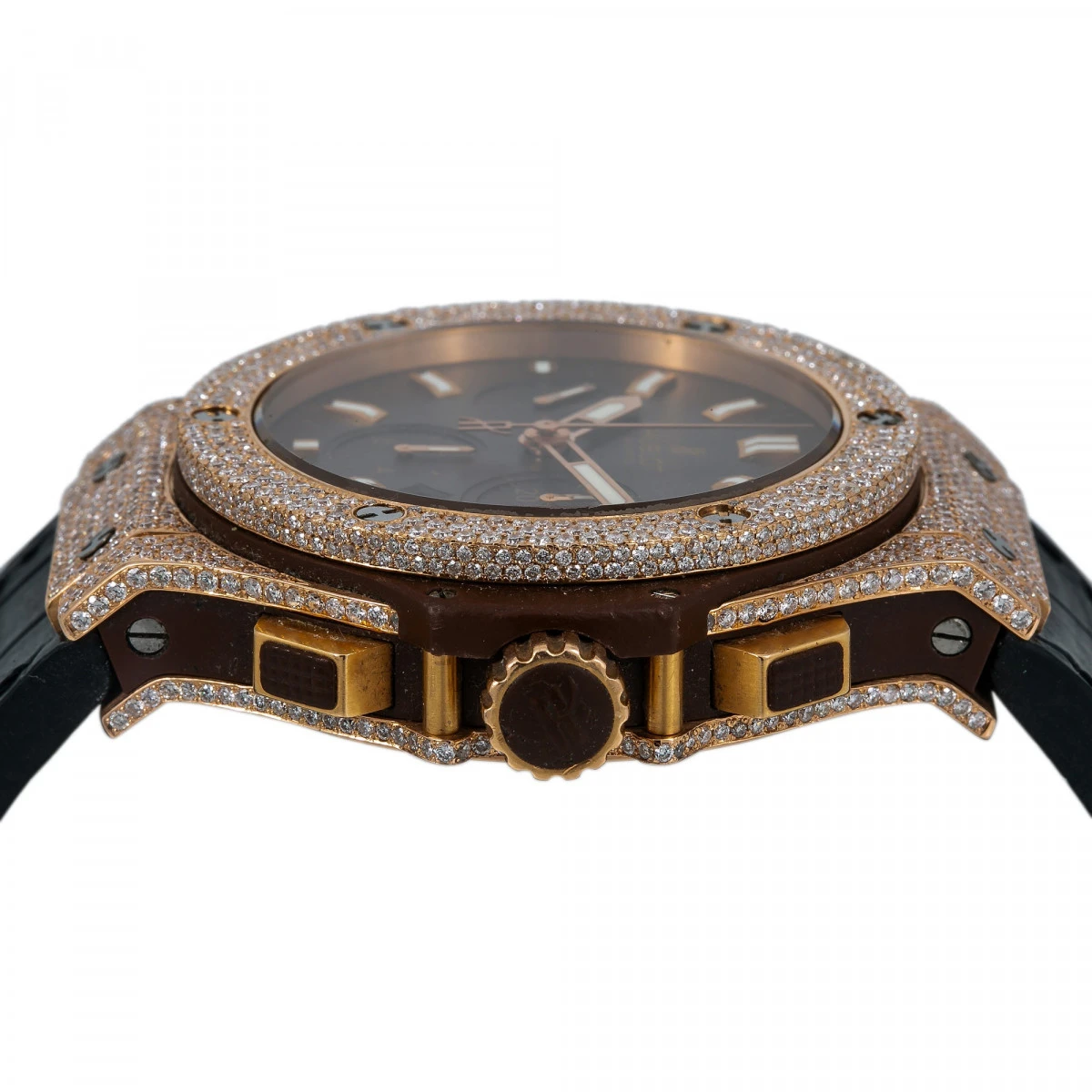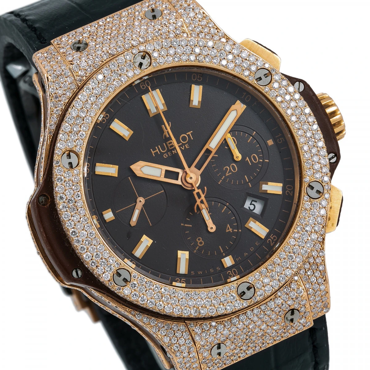 Introducing the Hublot Big Bang Rose Gold 41mm Brown Dial Men’s Diamond Watch. This luxurious timepiece is crafted from 18K rose gold and features a bezel set with 9.75 carats of white diamonds. The black rubber bracelet is comfortable and stylish, while the brown dial features three chronograph subdials and a date window at the 6 o’clock position. The watch is powered by an automatic movement and is water resistant up to 100 meters.The Hublot Big Bang Rose Gold 41mm Brown Dial Men’s Diamond Watch is the perfect accessory for any man who appreciates luxury and sophistication. The combination of rose gold and diamonds creates a timeless look that will never go out of style. The watch is also highly functional, with a chronograph and date window, and is water resistant up to 100 meters. This watch is sure to become a treasured heirloom that will be passed down for generations.The Hublot Big Bang Rose Gold 41mm Brown Dial Men’s Diamond Watch is a stunning timepiece that is sure to turn heads. With its luxurious materials and classic design, this watch is the perfect way to add a touch of sophistication to any outfit.