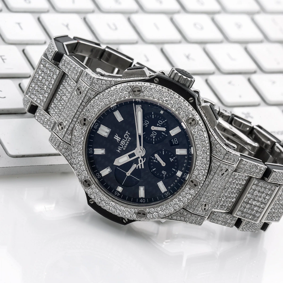 Introducing the Hublot Big Bang 44mm Black Dial W00896 Men’s Diamond Watch. This exquisite timepiece is crafted from stainless steel and features a white bezel with white diamond accents. The black dial is adorned with white diamond hour markers and a date window at the 3 o’clock position. The watch is powered by an automatic movement and is water-resistant up to 50 meters. The watch is also engravable, making it a perfect gift for a special occasion.The Hublot Big Bang 44mm Black Dial W00896 Men’s Diamond Watch is a luxurious and stylish timepiece that is sure to turn heads. The stainless steel bracelet is adorned with white diamond accents and is comfortable to wear. The sapphire crystal is scratch-resistant and ensures the watch is protected from everyday wear and tear. The watch is backed by a 5-year warranty, giving you peace of mind that your investment is protected.With its luxurious design and diamond accents, this watch is sure to make a statement. Whether you are looking for a special gift or a timeless timepiece for yourself, the Hublot Big Bang 44mm Black Dial W00896 Men’s Diamond Watch is the perfect choice.