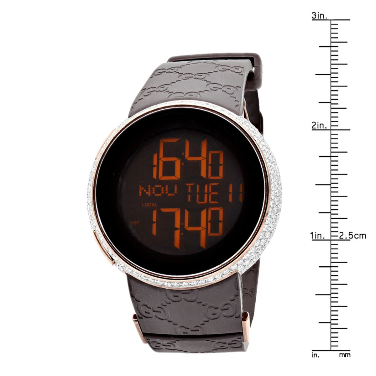 This Swiss-made Men’s Diamond Watch by Gucci features 3.10 carats of genuine diamonds around the brown stainless steel case, a scratch resistant sapphire crystal and a rubber band and a digital dial code with GMT second time zone feature. This diamond I-Gucci watch showcases a fine battery operated quartz movement and is water-resistant to 30 meters (100 feet water-resistant).