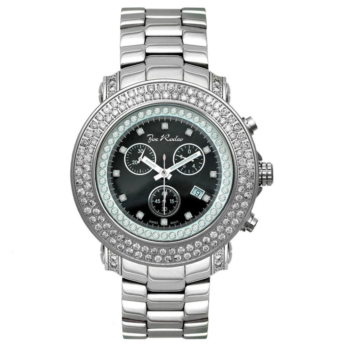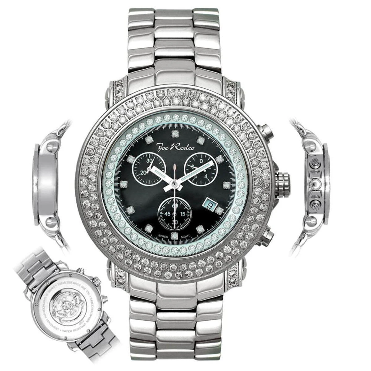 This men’s JoJo watch (Joe Rodeo Junior diamond watch) features 4.75 carats of diamonds, a round polished Silver stainless steel case, scratch-free crystal glass, individually numbered and engraved stainless steel case-back. Silver Stainless Steel band. Fine Swiss-made quartz movement. Water-resistant to 100 m (300 ft). This exquisite men’s diamond watch by Joe Rodeo comes with two interchangeable bands in different colors. The patented strap adjusts once for a perfect fit, and comes on and off with the press of a button.