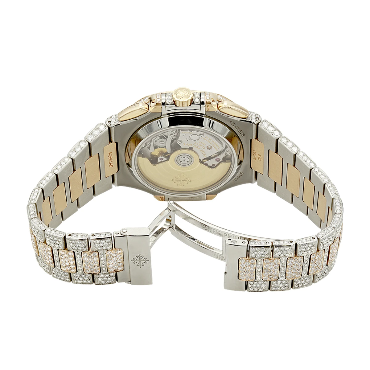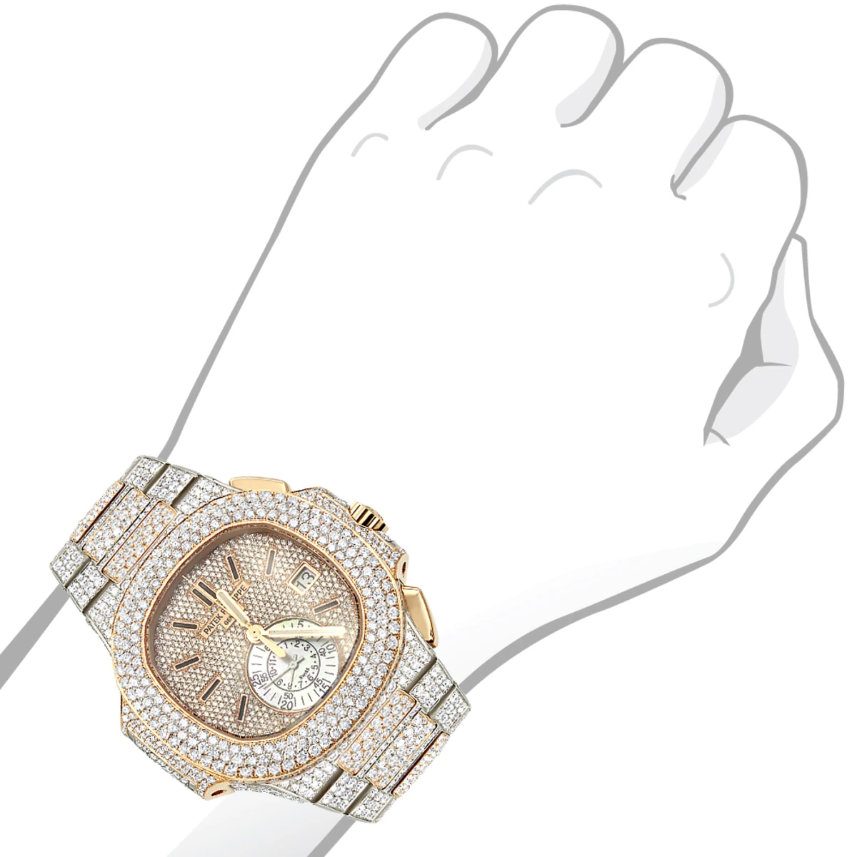 This breathtaking Patek Philippe Nautilus Iced Out Diamond Watch for Men showcases a stainless steel and 18K rose gold case, sapphire crystal back, diamond dial with gold applied hour markers with luminescent coating, self-winding Caliber CH 28-520 C movement with date, chronograph, 60-minute and 12-hour monocounter at 6 o’clock, stainless steel and 18K rose gold bracelet Nautilus fold-over clasp. This amazing Patek Philippe watch for men is decorated with 35 carats of sparkling VS quality round cut diamonds and comes with 1 year warranty from ItsHot.com.