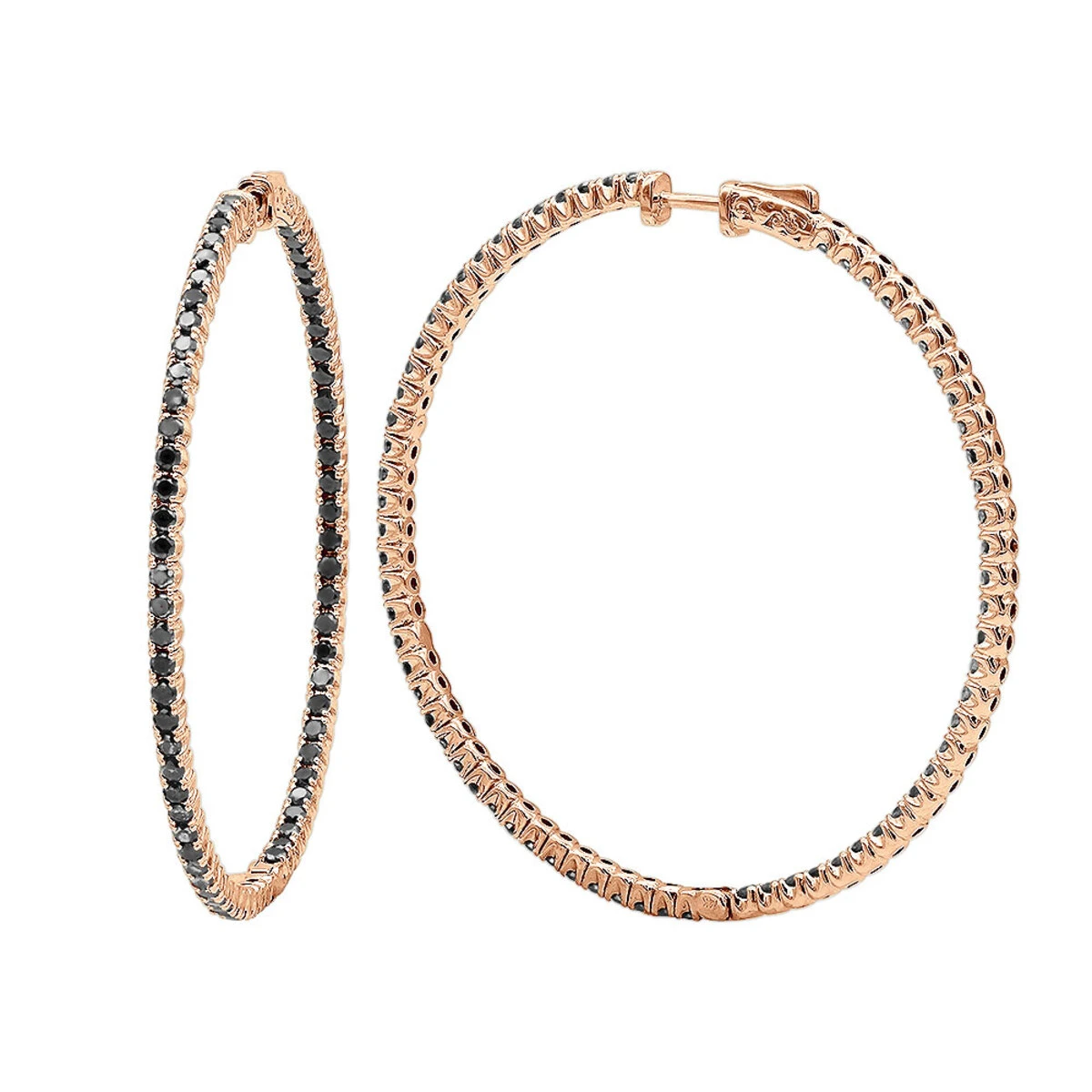 From our diamond earrings for women collection These enchanting 3 Carat Black Diamond 2 Inch Hoop Earrings feature popular Inside Out Design and are manufactured in solid 14k white, yellow and rose gold and are decorated with 3 carats (1.5ct each) of high quality black round diamonds. Without much metal blocking the diamonds shine and beauty, these fantastic black diamond hoop earrings leave a long lasting impression. Being 1/16in. (2mm) wide and just over 2 inches long (58mm), the earrings are featuring an inside out design and look splendid from every angle. These black diamond hoops include a beautiful packaging and make a fabulous gift for any occasion!