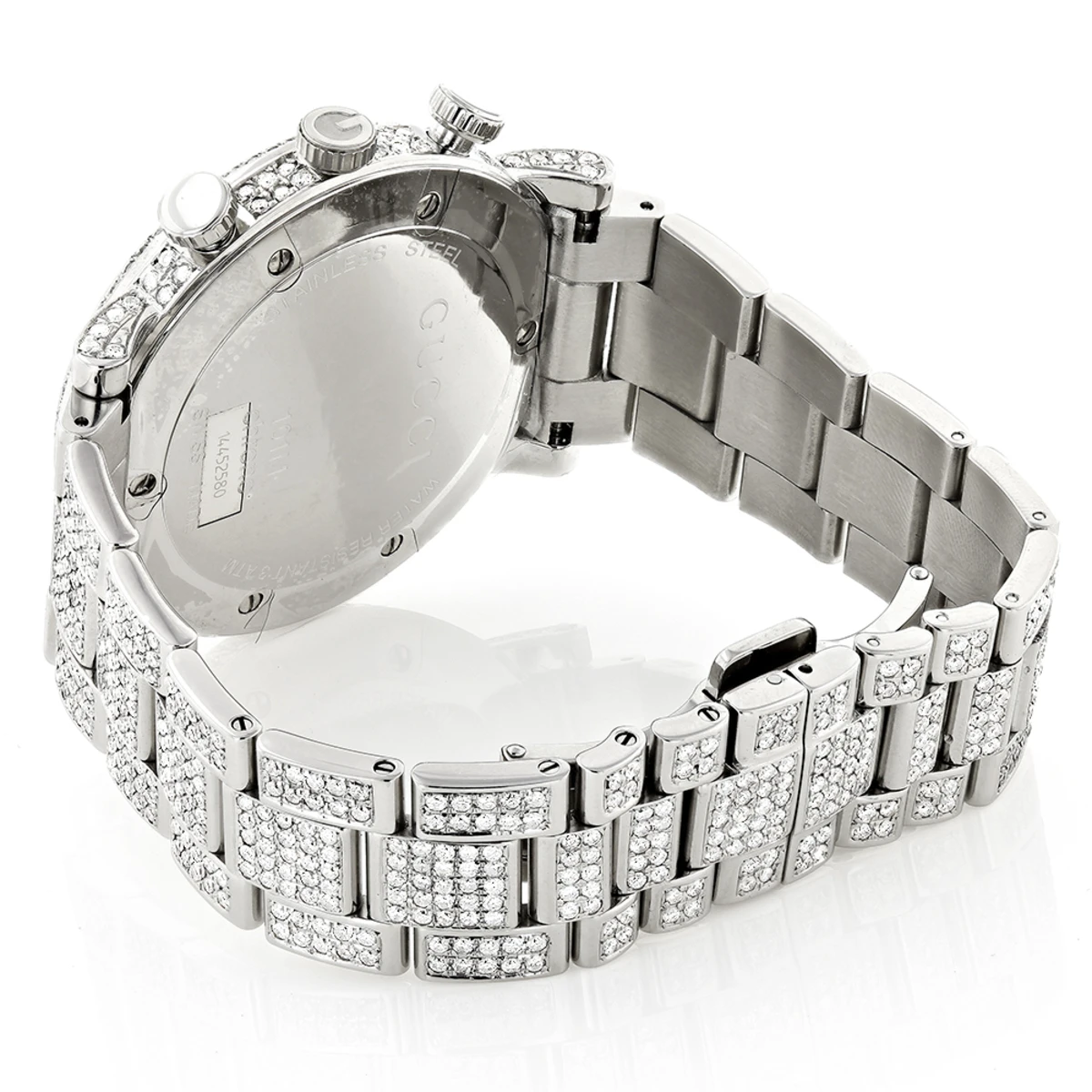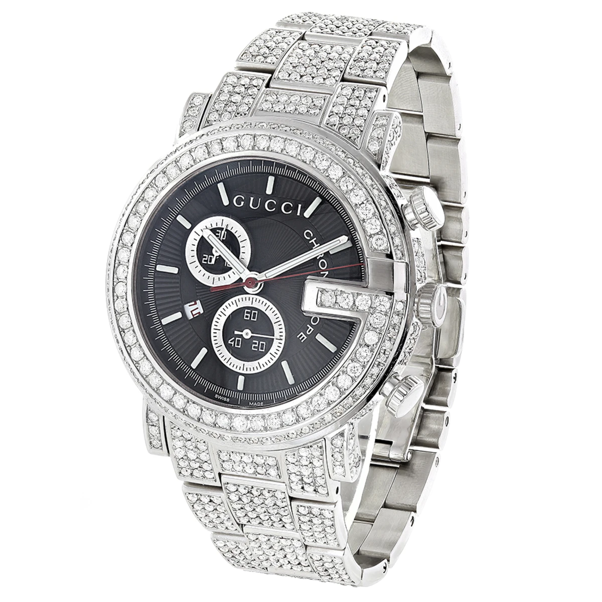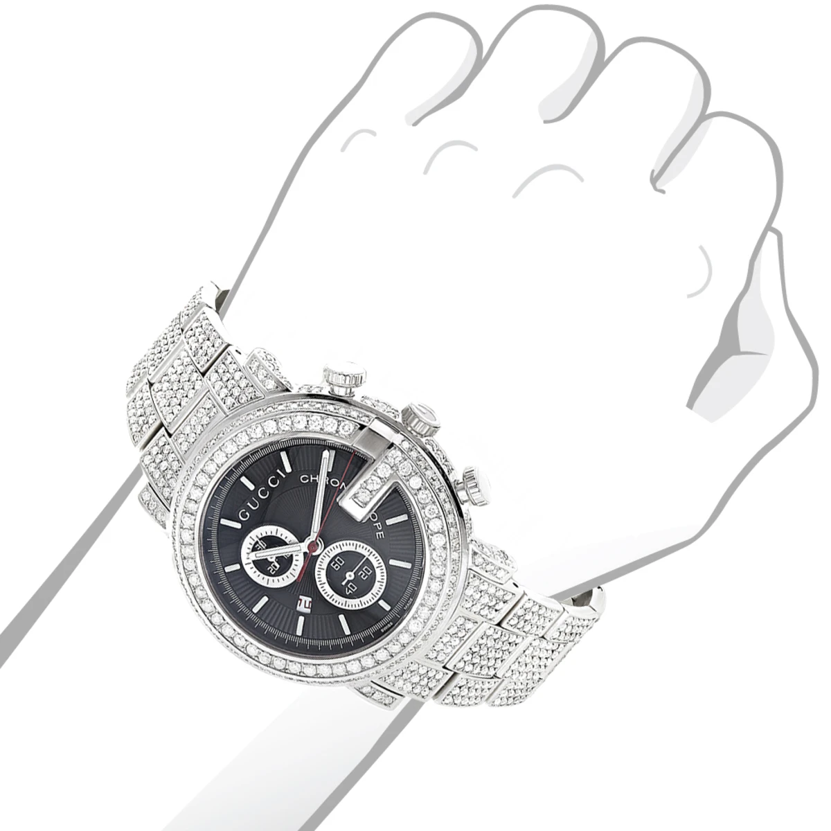 Introducing the diamond Gucci G-Chrono watch for men. This luxurious timepiece is crafted with the finest materials and features a stunning design that is sure to turn heads. The watch features a stainless steel case and bezel with a silver color finish. The watch is paved with 15 carats of genuine diamonds, each masterfully set around the bezel, on the sides of the silver-tone stainless steel case, lugs, and the band. The bezel is adorned with white diamonds that sparkle and shine. The bracelet is also made of stainless steel with a silver color finish and is adorned with white diamonds. The black dial features silver-tone hands and stick markers, and is protected by a scratch-resistant window. The watch is powered by a Swiss-Quartz movement and features a chronograph and date indicator functions. The watch is secured with a deployant clasp and is water resistant up to 30 meters. This exquisite timepiece is perfect for any occasion and will make a great addition to any collection. The real diamond iced-out men’s Gucci G-Chrono Watch YA101309 is sure to be a treasured piece for years to come.