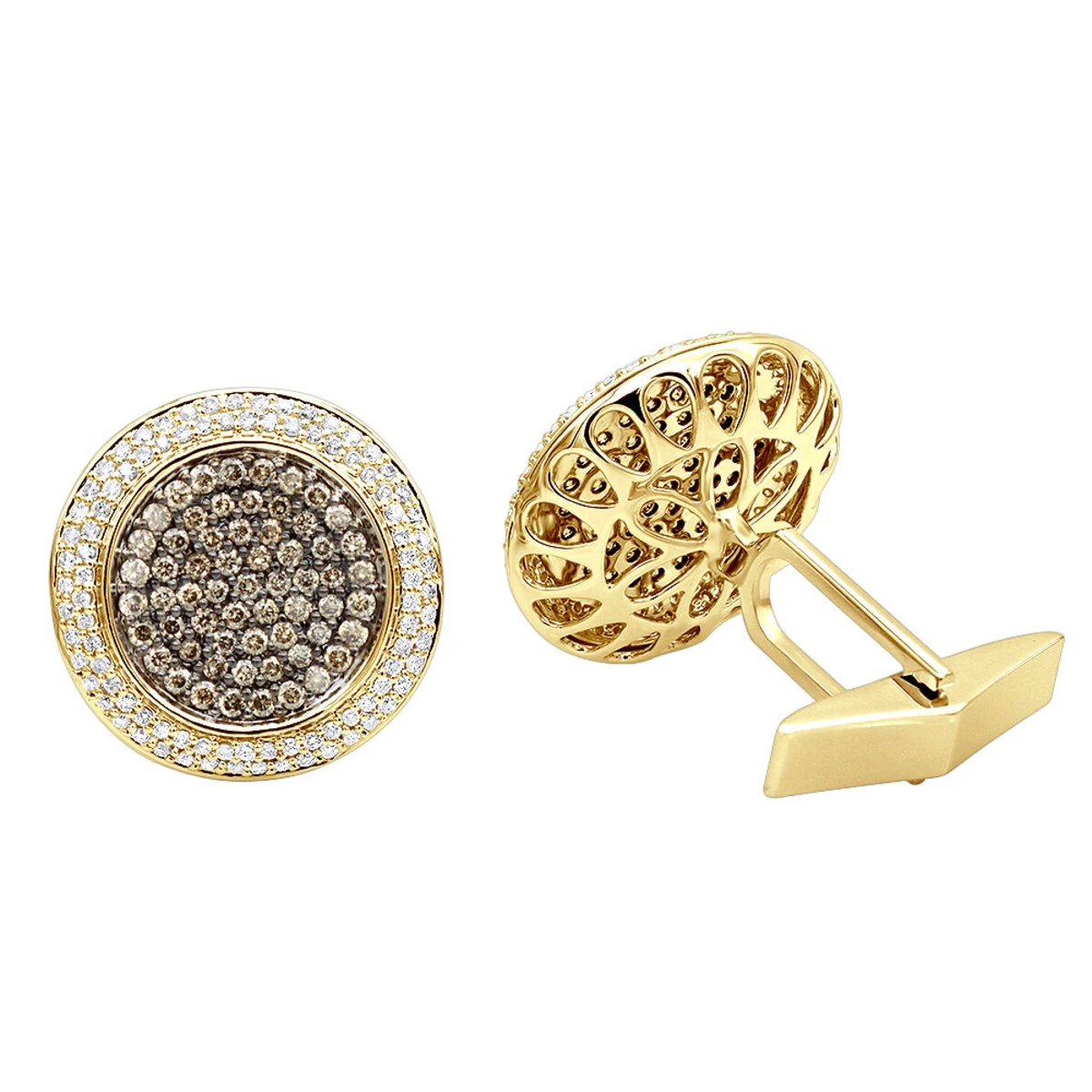 These Round Champagne and White Diamond Men’s Cufflinks in 14K gold showcase 1.9 carats of sparkling diamonds. Featuring a stylish combination of bright polished gold finish and a black rhodium plating, these gorgeous cufflinks are available in 14K white, yellow and rose gold.