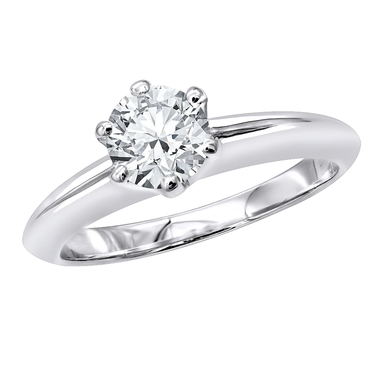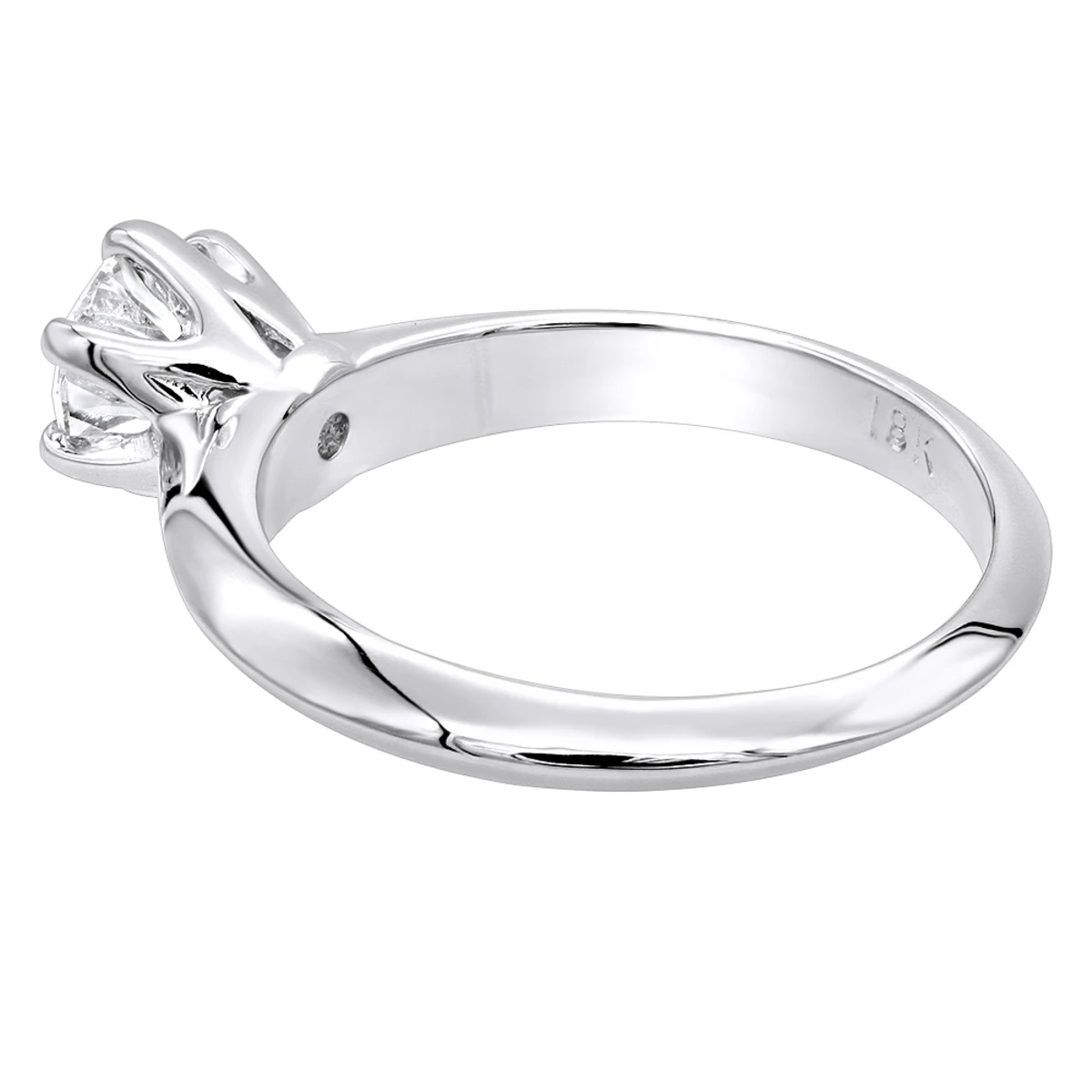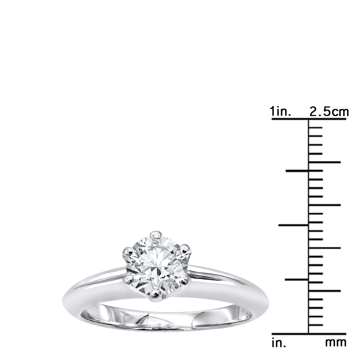 Luxurman Diamond Engagement Rings: This Solitaire Diamond Engagement Ring features a classic Tiffany style of an 18k band with a single 0.75 carat white and clear (H/SI) round diamond set securely by 6 prongs; this classy round cut diamond engagement ring has high prongs to really show case that nice diamond and is available in 18k white gold, yellow gold, rose gold as well as platinum as a custom order.