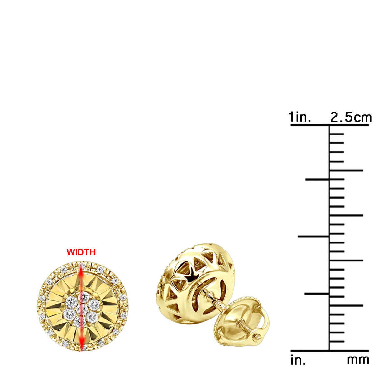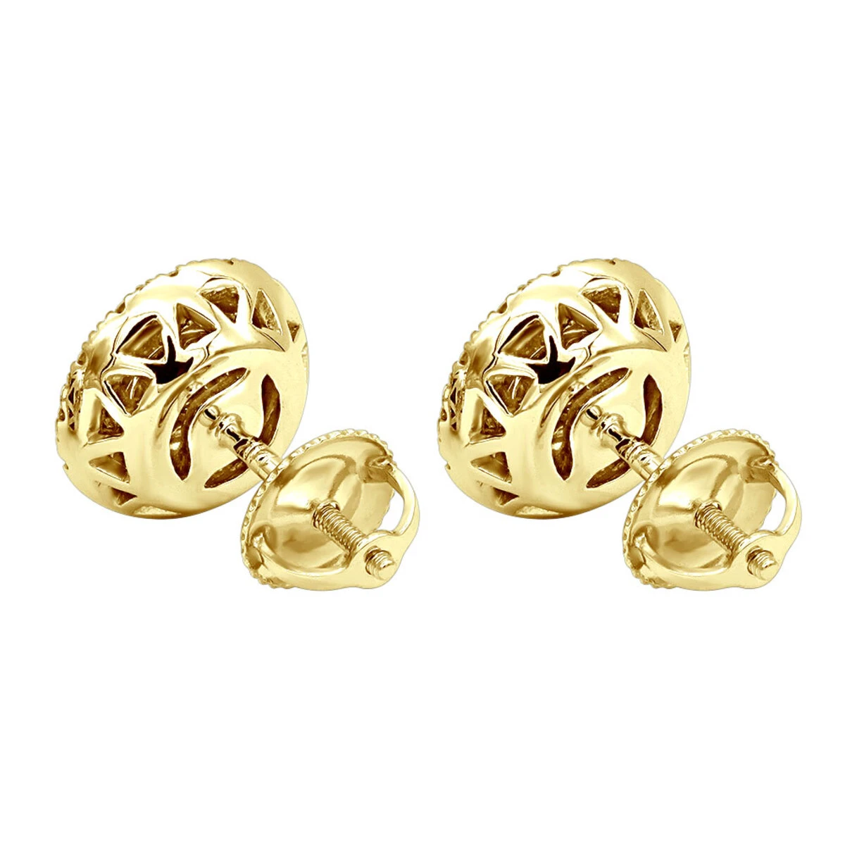 From our unique diamond earrings for men and women and diamond stud earrings collections These 14K Gold Affordable Diamond Earrings Studs are huge and have a look of earrings with 2 carat center diamond due to their unique diamond setting and showcases 0.2 carats of sparkling cluster set round diamonds in the middle and a halo setting on the outside around the earrings. Available in 14K white, yellow or rose gold, these lovely unisex diamond earrings design makes diamonds in the middle look wrapped in gold, and the halo with white round diamonds adds even more sparkle. The earrings weigh approximately 3.5 grams, feature secure screw-back closure and quite large at 3/8in (10mm) in diameter, they will make an affordable yet very nice addition to any jewelry collection.